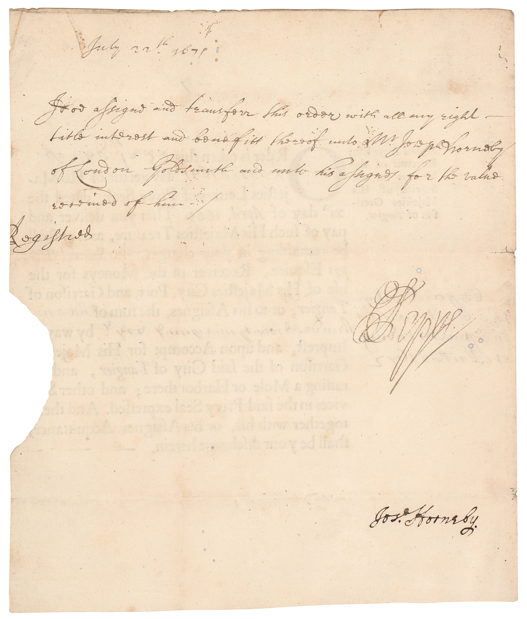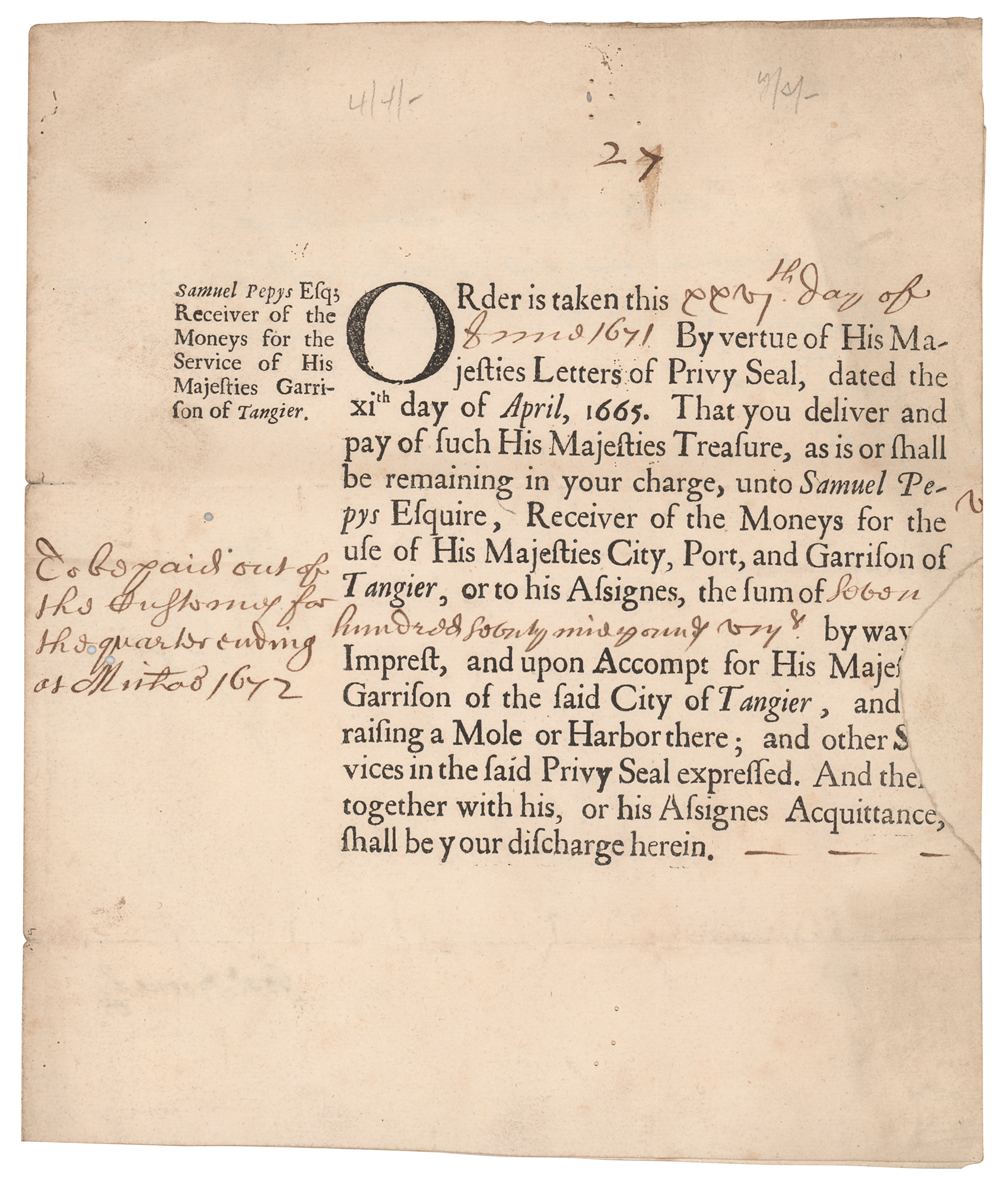 British civil servant (1633-1703) best remembered as the author of a nine-year, multi-volume diary, one of the essential documents of 17th-century British history and literature. Partly-printed DS, signed ?S. Pepys,? one page both sides, 7.25 x 8.75, July 22, 1671. In the partly-printed document on the front, as "Receiver of the Moneys for the Service of His Majesties Garrison of Tangier," Pepys demands the sum of 779 pounds. On the reverse, Pepys pens a handwritten assignation "for this order with all my right, title interest and benefit thereof unto Mr. Joseph Horneby of London Goldsmith and unto his assigns for the value." In very good to fine condition, with trimmed edges, and scattered tiny insect holes.