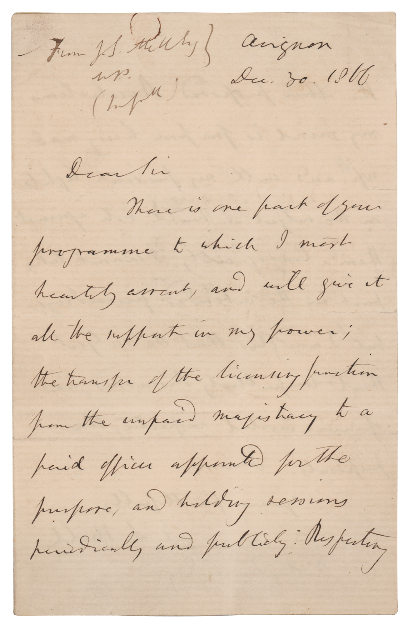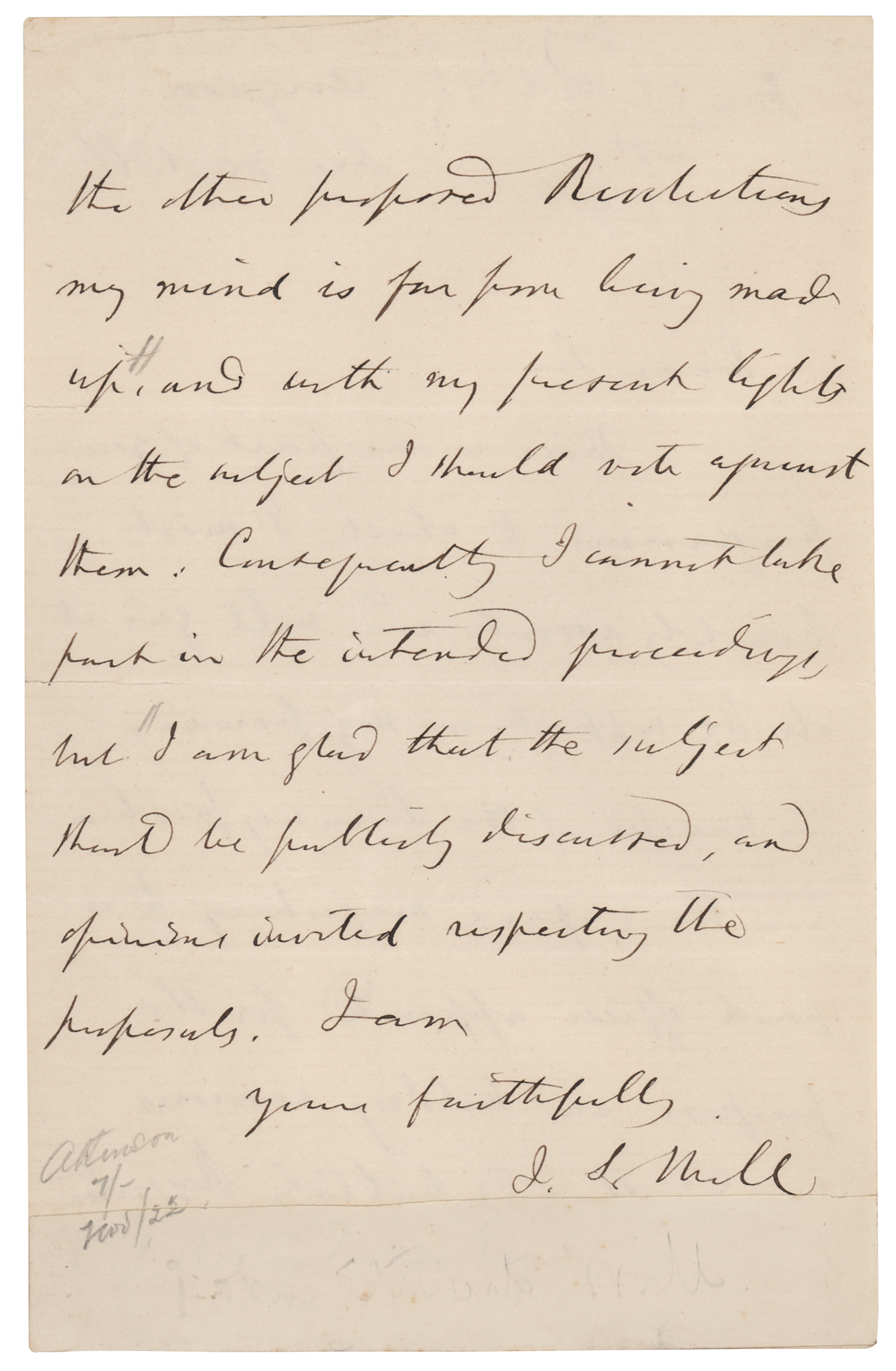 British philosopher and civil servant (1806-1873) who was an influential contributor to social theory, political theory, and political economy. ALS signed ?J. S. Mill,? one page both sides, 4.25 x 6.75, December 30, 1866. Handwritten letter to a gentleman, in full: "There is one part of your programme to which I most heartily assent, and will give it all the support in my power; the transfer of the licensing function from the unpaid magistrary to a paid office appointed for the purpose, and holding sessions periodically and publicly respecting the other proposed Resolutions my mind is far from being made up, and with my present lights on the subject I should vote against them. Consequently I cannot take part in the intended proceedings, but I am glad that the subject should be publicly discussed, and opinions invited respecting the proposals." In fine condition, with slight splitting to one of the fold ends.