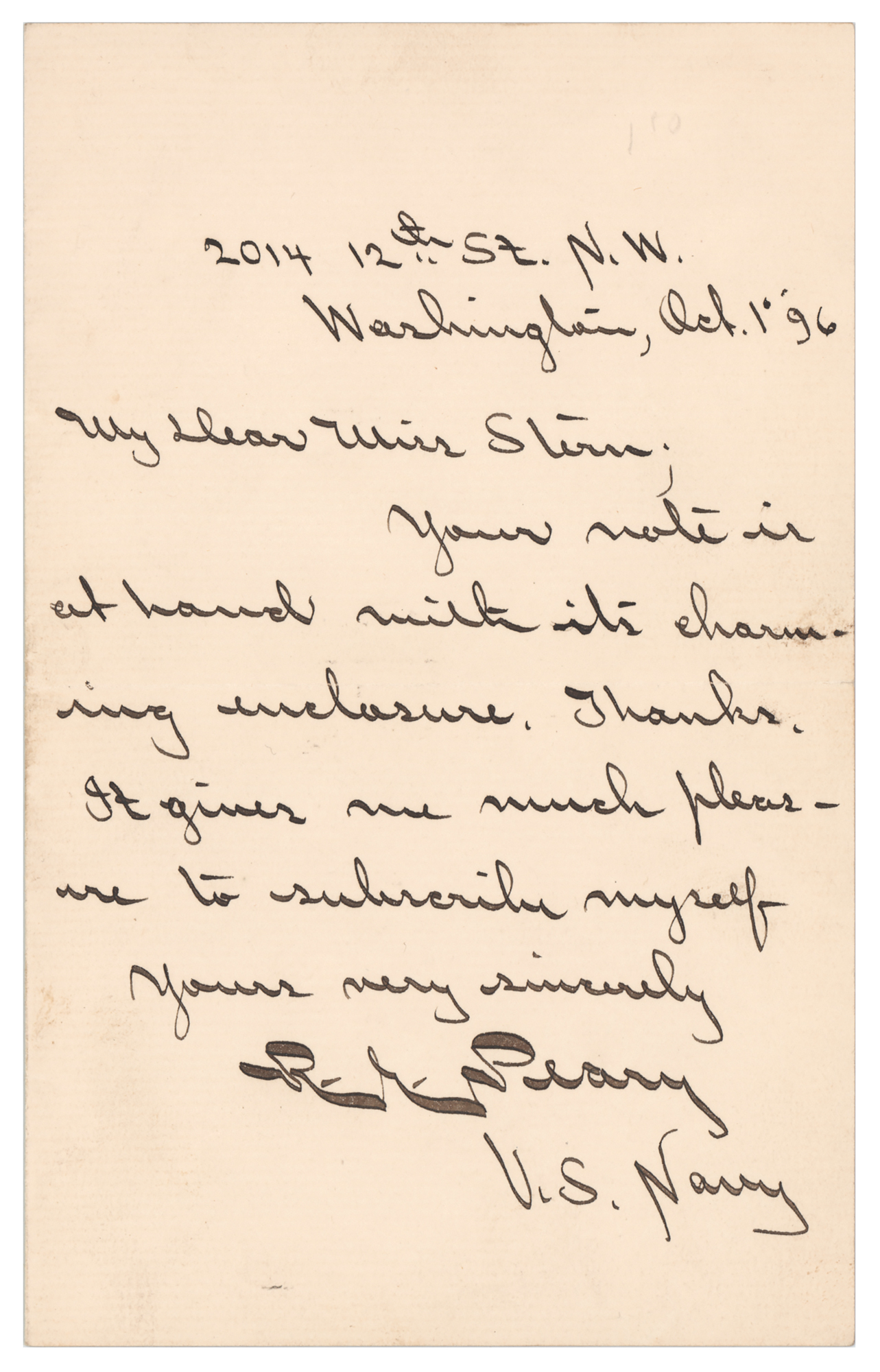 ALS signed “R. E. Peary, U.S. Navy,” one page, 4.25 x 6.75, October 1, 1896. Neatly penned handwritten letter, in full: "Your note is at hand with its charming enclosure. Thanks. It gives me much pleasure to subscribe myself." In fine condition.