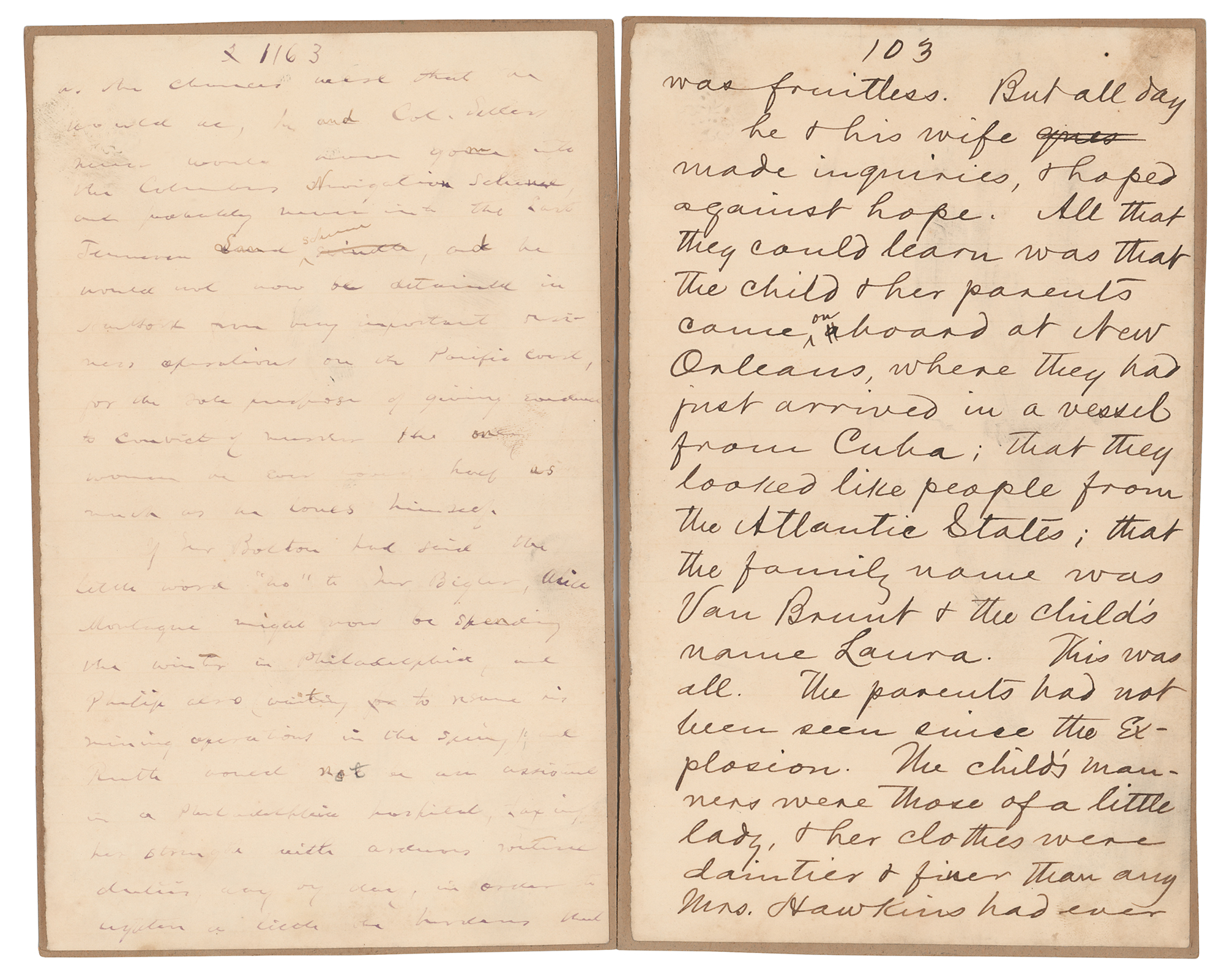 Unsigned handwritten manuscript pages by Samuel Clemens and Charles Dudley Warner, each one page, 5 x 8, no date but circa 1873. Pages from the manuscript for The Gilded Age: A Tale of Today, a collaborative novel written by Mark Twain and Charles Dudley Warner. Marked as page "103" at the top, Clemens writes, in full: "was fruitless. But all day he & his wife made inquiries, & hoped against hope. All that they could learn was that the child and her parents came on board at New Orleans, where they had just arrived in a vessel from Cuba; that they looked like people from the Atlantic States; that the family name was Van Brunt & the child's name Laura. This was all. The parents had not been seen since the explosion. The child's manners were those of a little lady, and her clothes were daintier & finer than any Mrs. Hawkins had ever."
