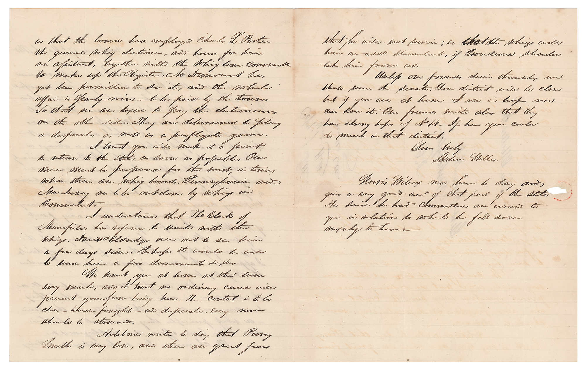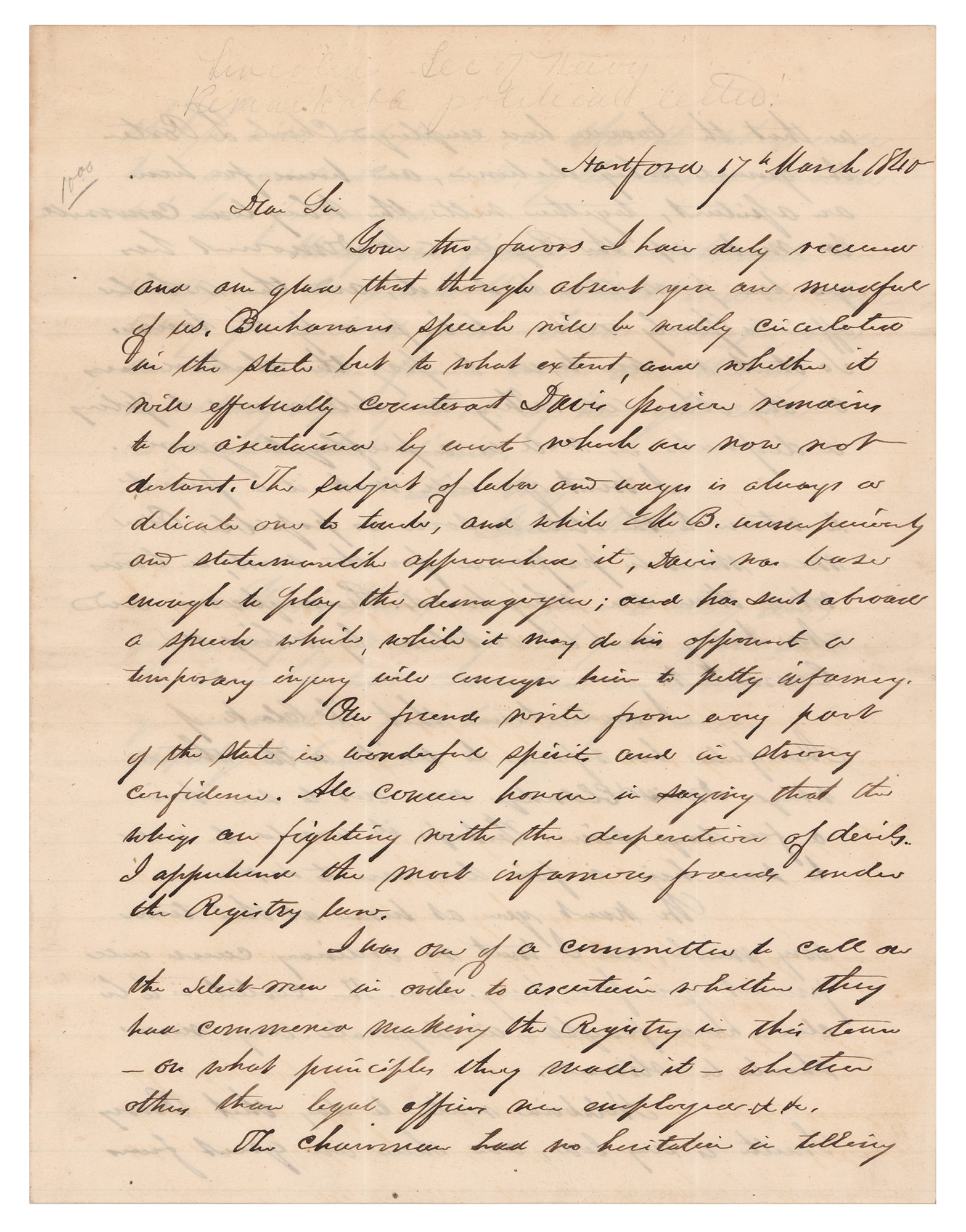 ALS, three pages on two adjoining sheets, 8 x 10, March 17, 1840. Handwritten letter to Orrin Holt, in part: "Buchanan's speech will be widely circulated in the state but to what extent, and whether it will effectually counteract Davis poison remains to be ascertained by events which are now not distant. The subject of labor and wages is always a delicate one to touch?Davis was base enough to play the demagogue?Whigs are fighting with the desperation of devils. I apprehend the most infamous frauds under the Registry law. I was one of a committee to call on the select-men in order to ascertain whether they had commenced making the Registry in this term?on what principles they made it?whether others than legal officers are employed &c &c?I trust you will make it a point to the state as soon as possible. Our men must be prepared for the worst, in towns where there are voting boards. Pennsylvania and New Jersey are to be outdone by Whigs in Connecticut." Hand addressed and franked on the integral leaf by Welles as Postmaster of Hartford. In fine condition, with a small area of seal-related paper loss to the integral address leaf.