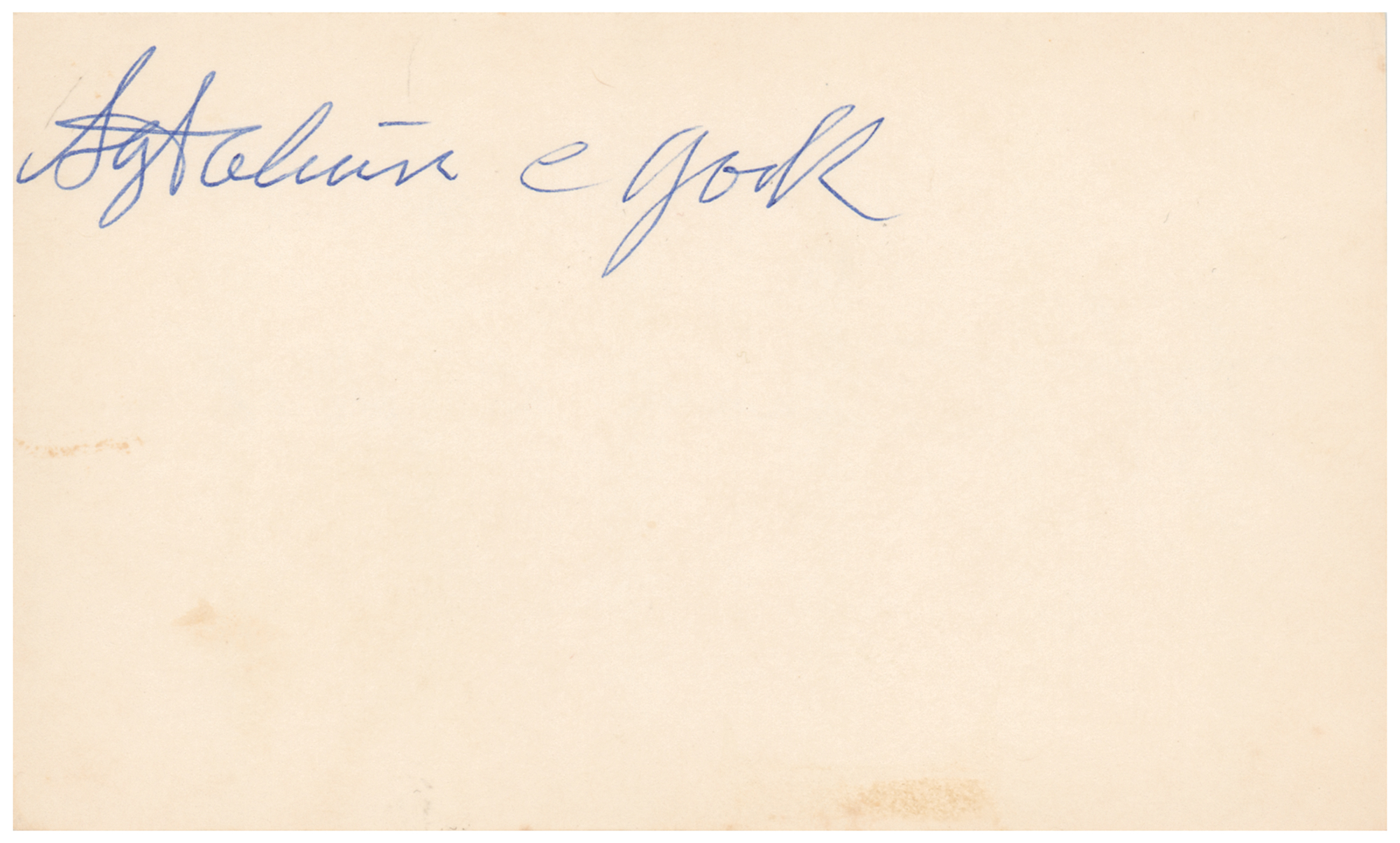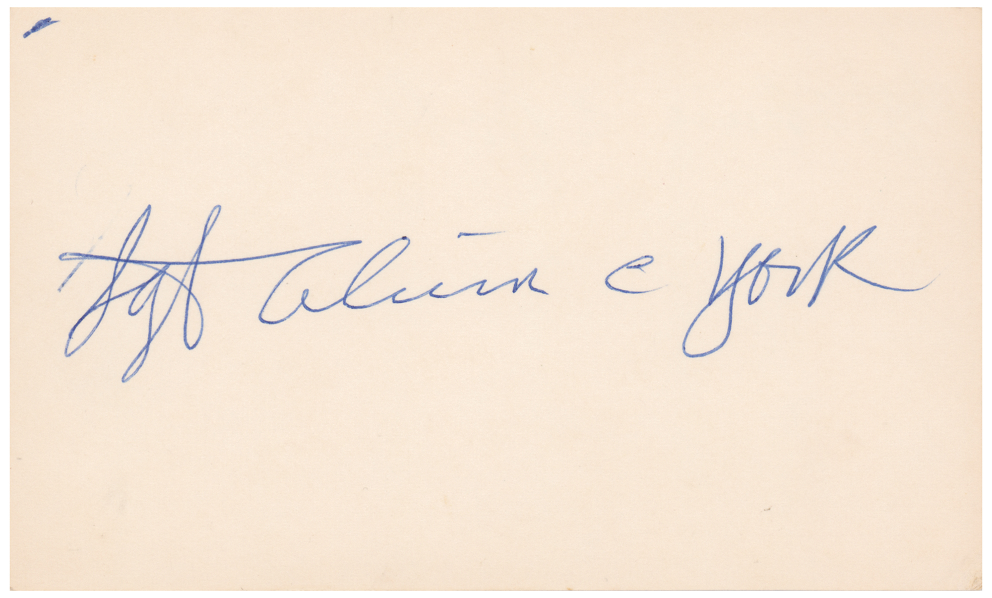 Off-white 5 x 3 card signed twice in blue ballpoint by Sgt. Alvin C. York, once on the front and then on the back. In fine condition.