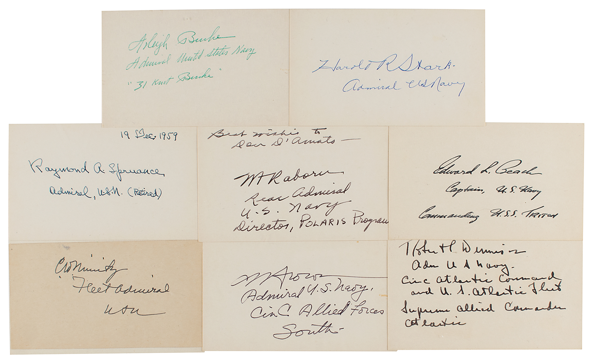 Group lot of eight signatures of noted U.S. Navy admirals and captains that served during World War II, individually penned in ink on off-white 5 x 3 cards (or on a slip affixed to a card), each adding rank and service branch, including: Chester Nimitz, Harold Rainsford Stark, Arleigh Burke, Raymond A. Spruance, Charles R. Brown, William Raborn, Robert Dennison, and Edward L. Beach, Jr. In overall fine condition.