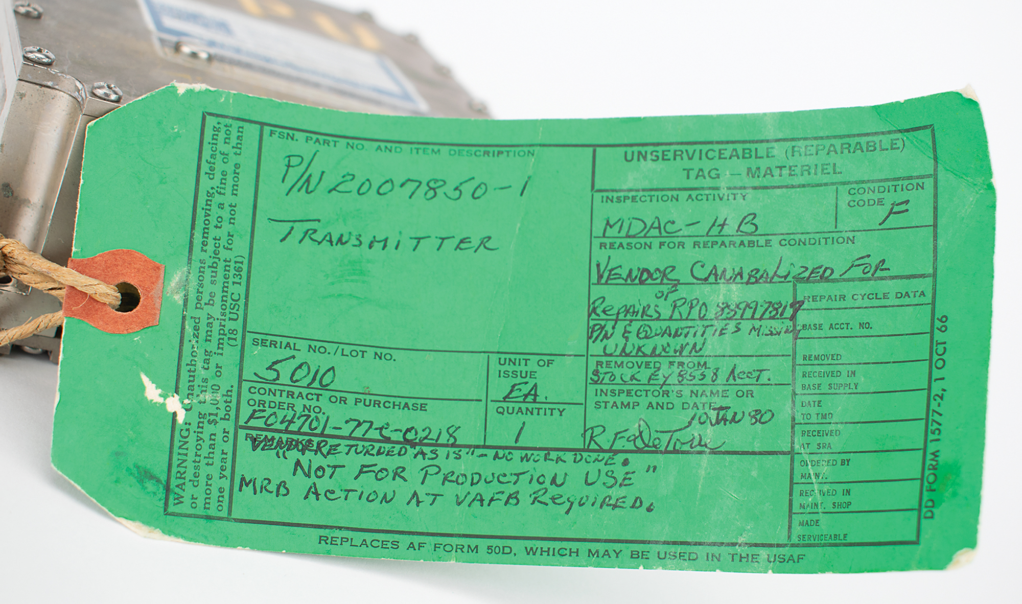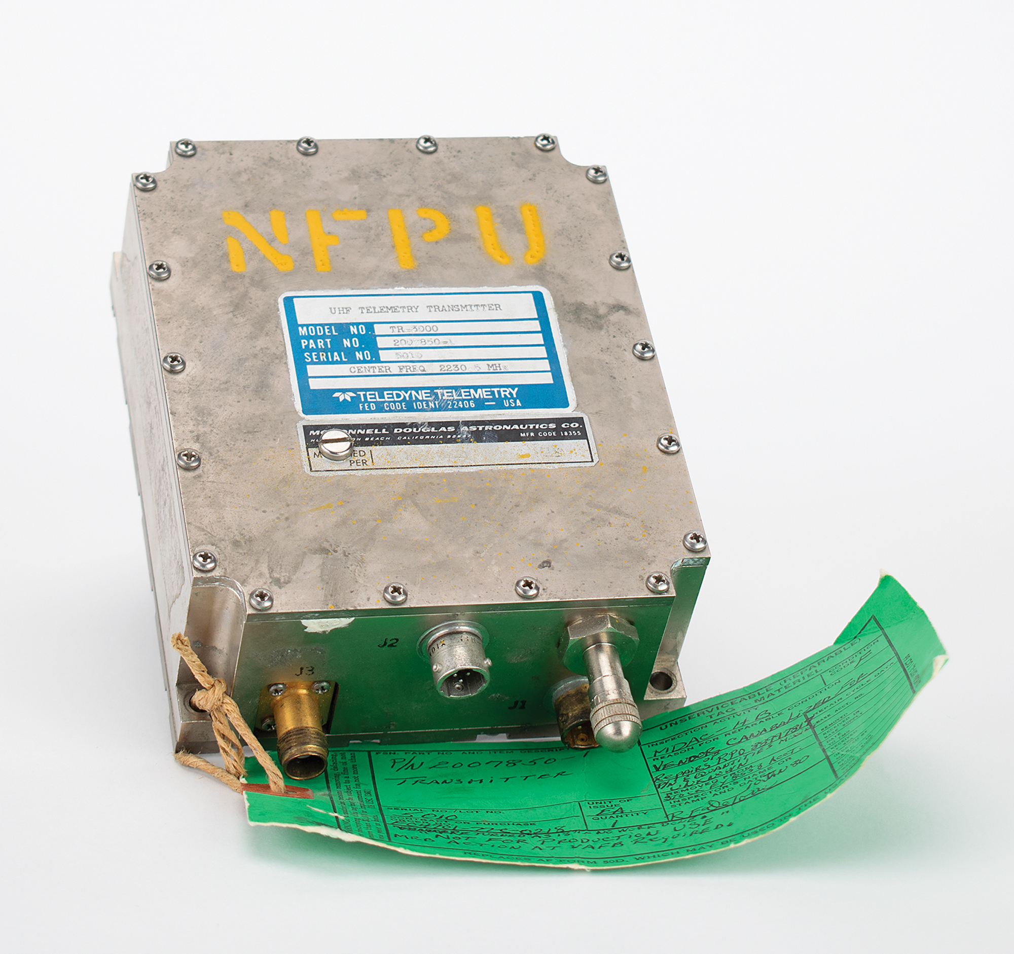 UHF telemetry transmitter associated with a US Air Force launch program at Vandenberg Air Force Base, measuring 4.5″ x 6″ x 2″, with a Teledyne label on top: "UHF Telemetry Transmitter, Model No. TR-3000, Part No. 2007850-1, Serial No. 5010, Center Freq. 2230.5 MHz." A green "Unserviceable (Reparable) Tag—Materiel" tag is attached.