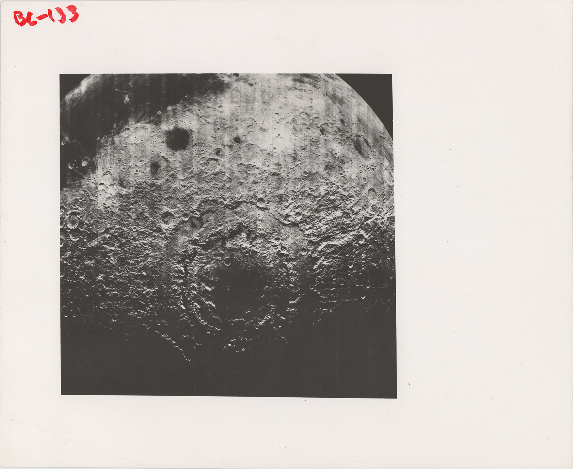Original glossy 10 x 8 photograph of the 'dark side' of the moon, seen for the first time in high resolution from recovered Lunar Orbiter tape storage at NASA Ames. Marked in the corner in felt tip, "BC-133." In fine condition, with some light surface creasing.