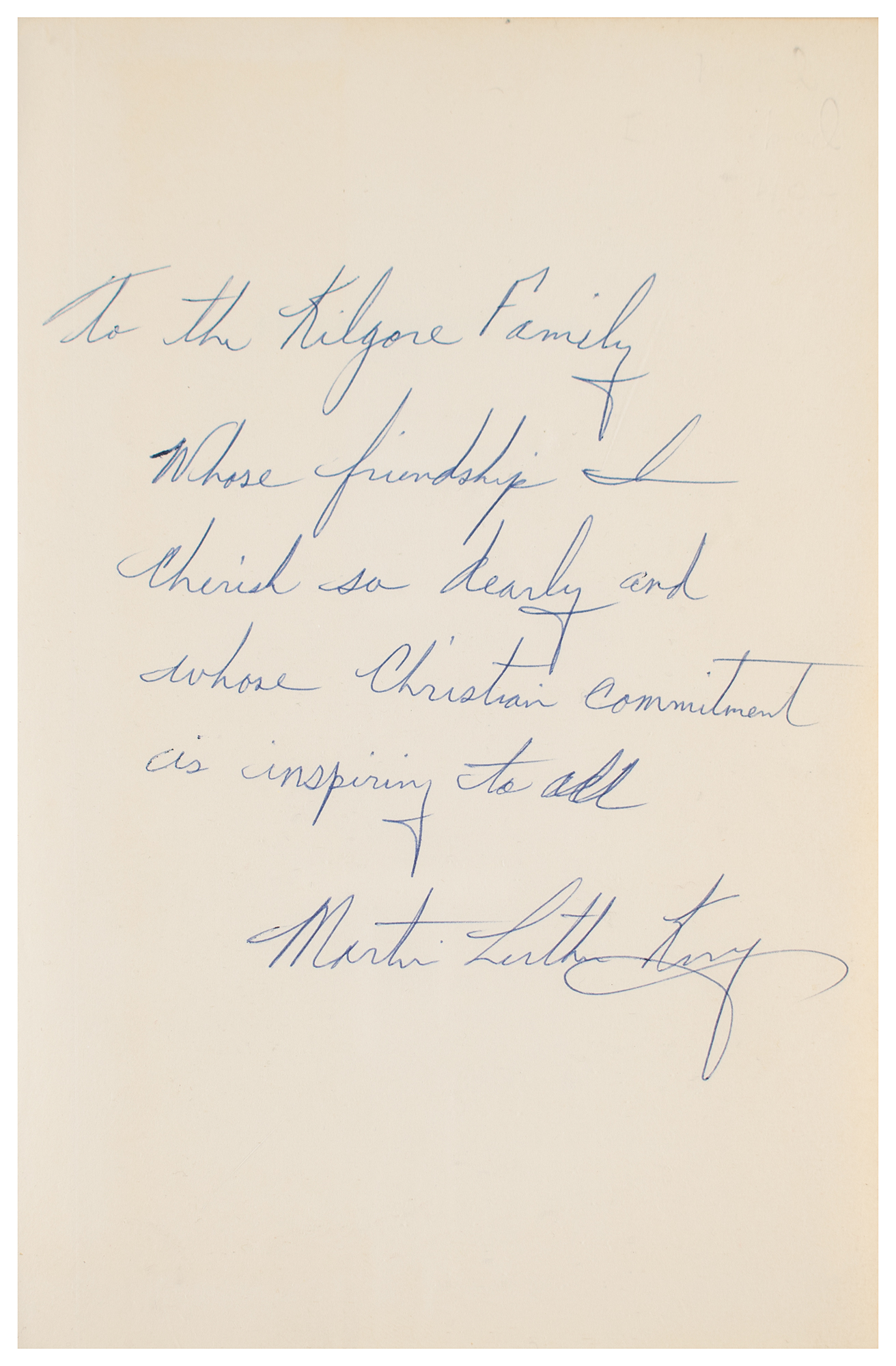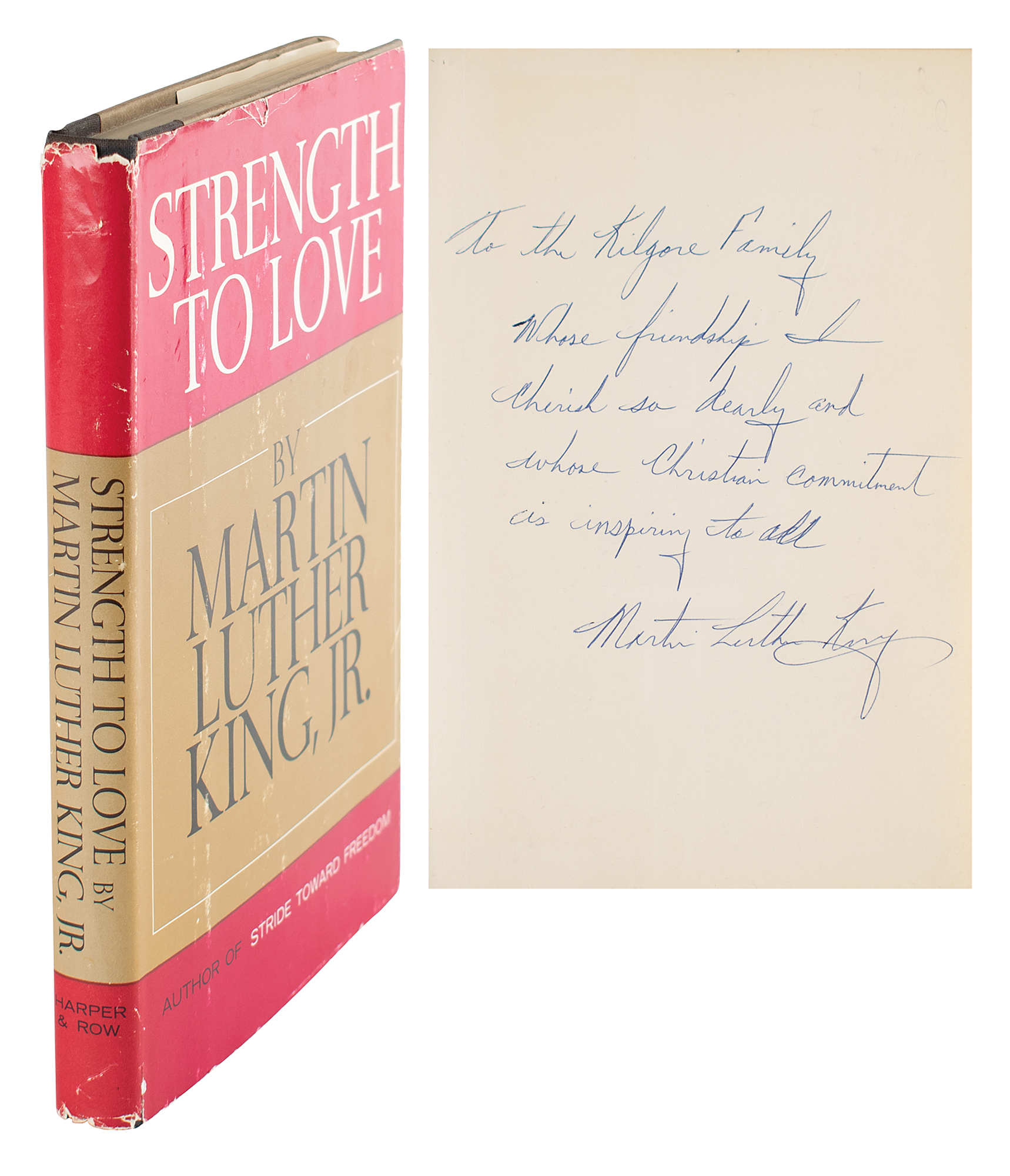 Signed book: Strength to Love. First edition. NY: Harper & Row, 1963. Hardcover with dust jacket, 5.75 x 8.75, 146 pages. Signed and inscribed on the first free end page in blue ballpoint, "To the Kilgore Family, Whose friendship I cherish so dearly and whose Christian commitment is inspiring to all, Martin Luther King." Autographic condition: fine. Book condition: VG/VG, with moderate rubbing and a few edge nicks to jacket.
