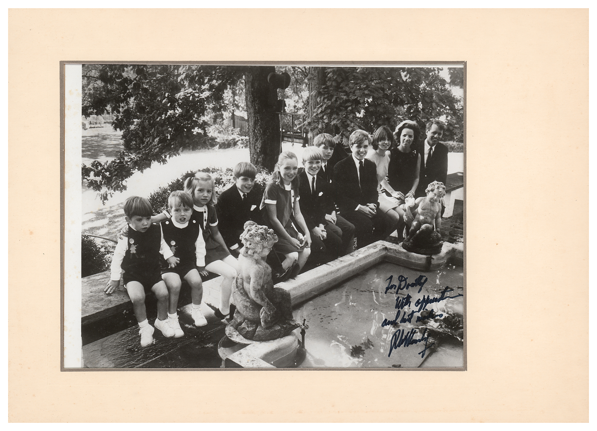 Glossy 10 x 8 photo of the large Kennedy family sitting on a park bench, signed and inscribed in black felt tip to Capitol Hill intern Dorothea Megna, "For Dorothy, with appreciation and best wishes, Robert F. Kennedy.” Housed in its original Delma studio folder. In fine condition, with light spotting to the emulsion, visible at an angle. Accompanied by a photocopy of her invitation to a "Summer Swim Party" hosted by Senators Edward and Robert Kennedy in Virginia on August 9, 1966.