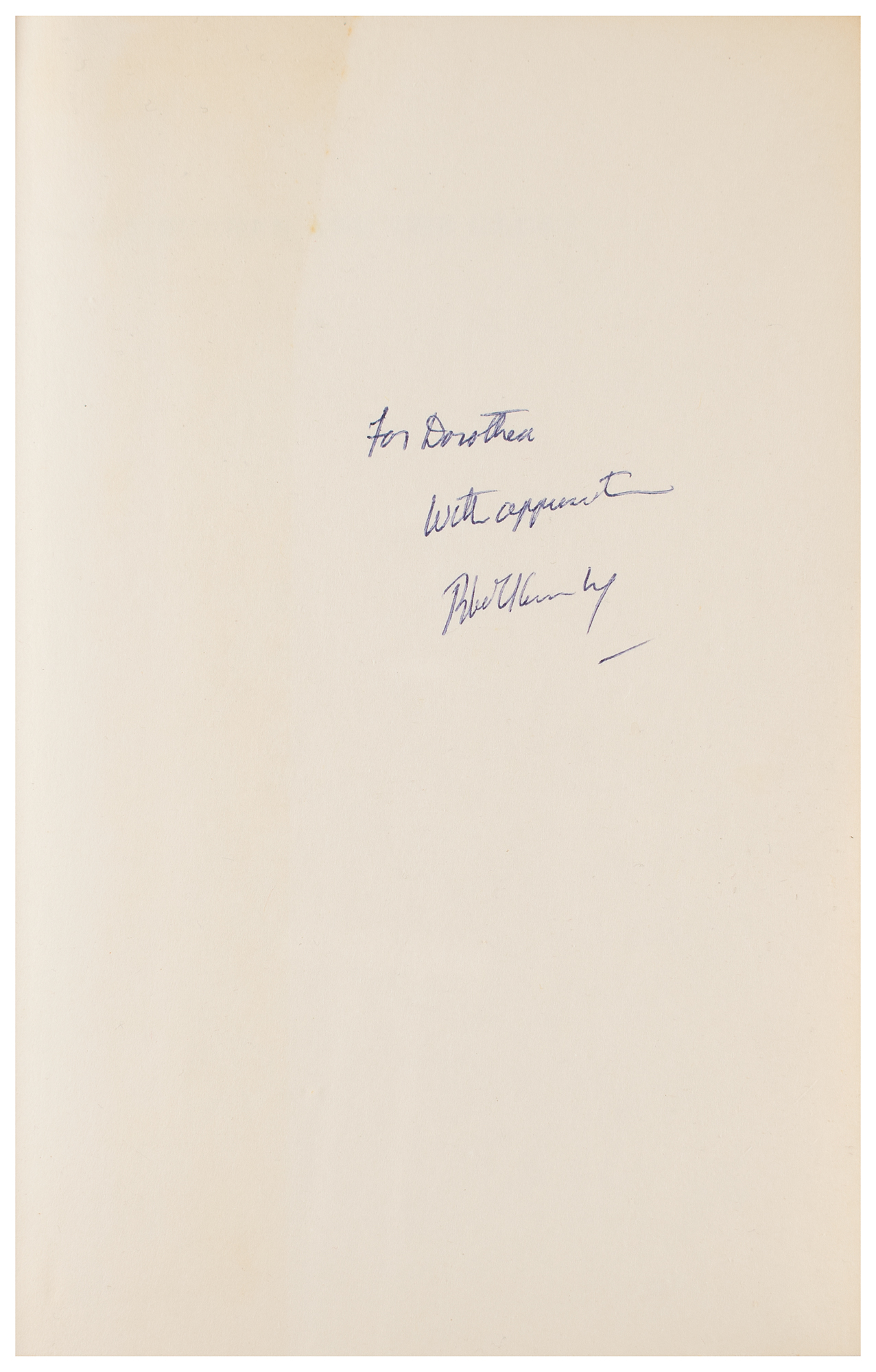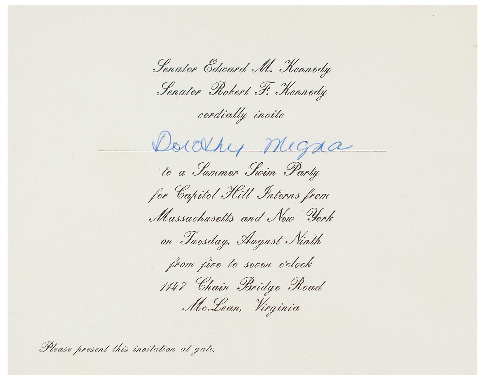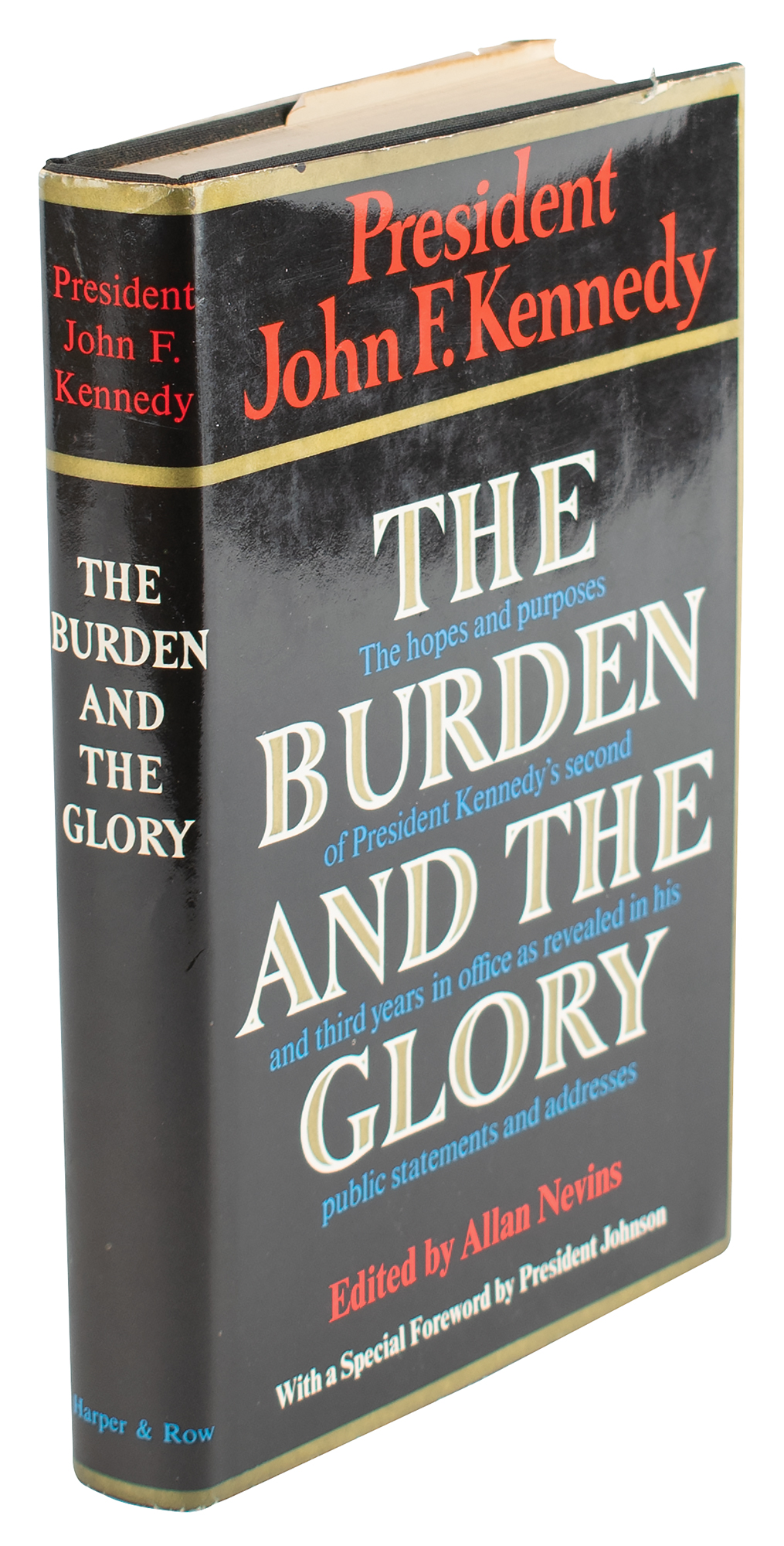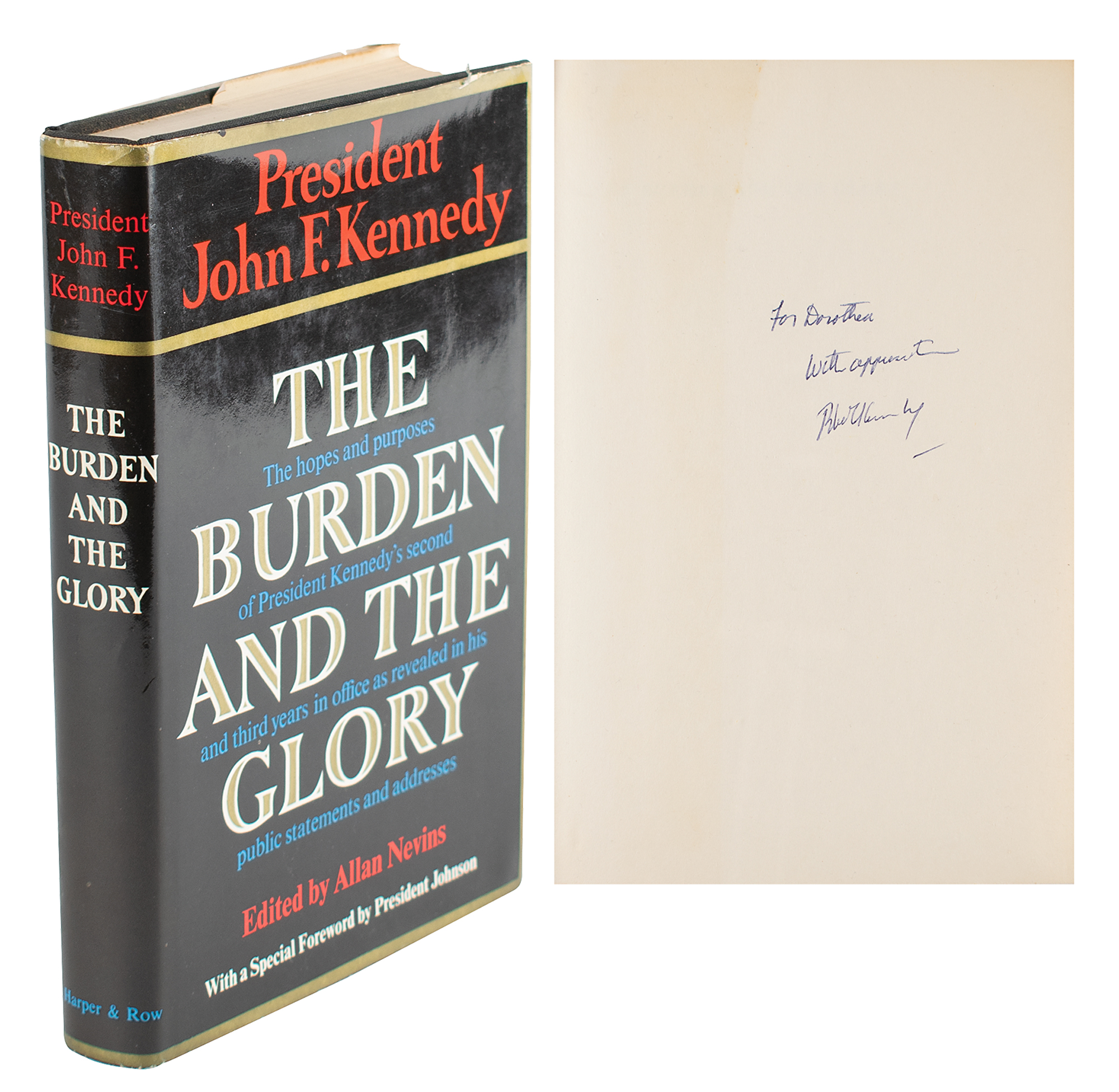 Signed book: The Burden and the Glory. Later printing. NY: Harper & Row, 1964. Hardcover with dust jacket, 6 x 8.5, 293 pages. Signed and inscribed on the first free end page in blue ballpoint to Capitol Hill intern Dorothea Megna, "For Dorothea, With appreciation, Robert Kennedy." In fine condition, with some faint toning to the signed page. Accompanied by an invitation to a "Summer Swim Party" hosted by Senators Edward and Robert Kennedy in Virginia on August 9, 1966.