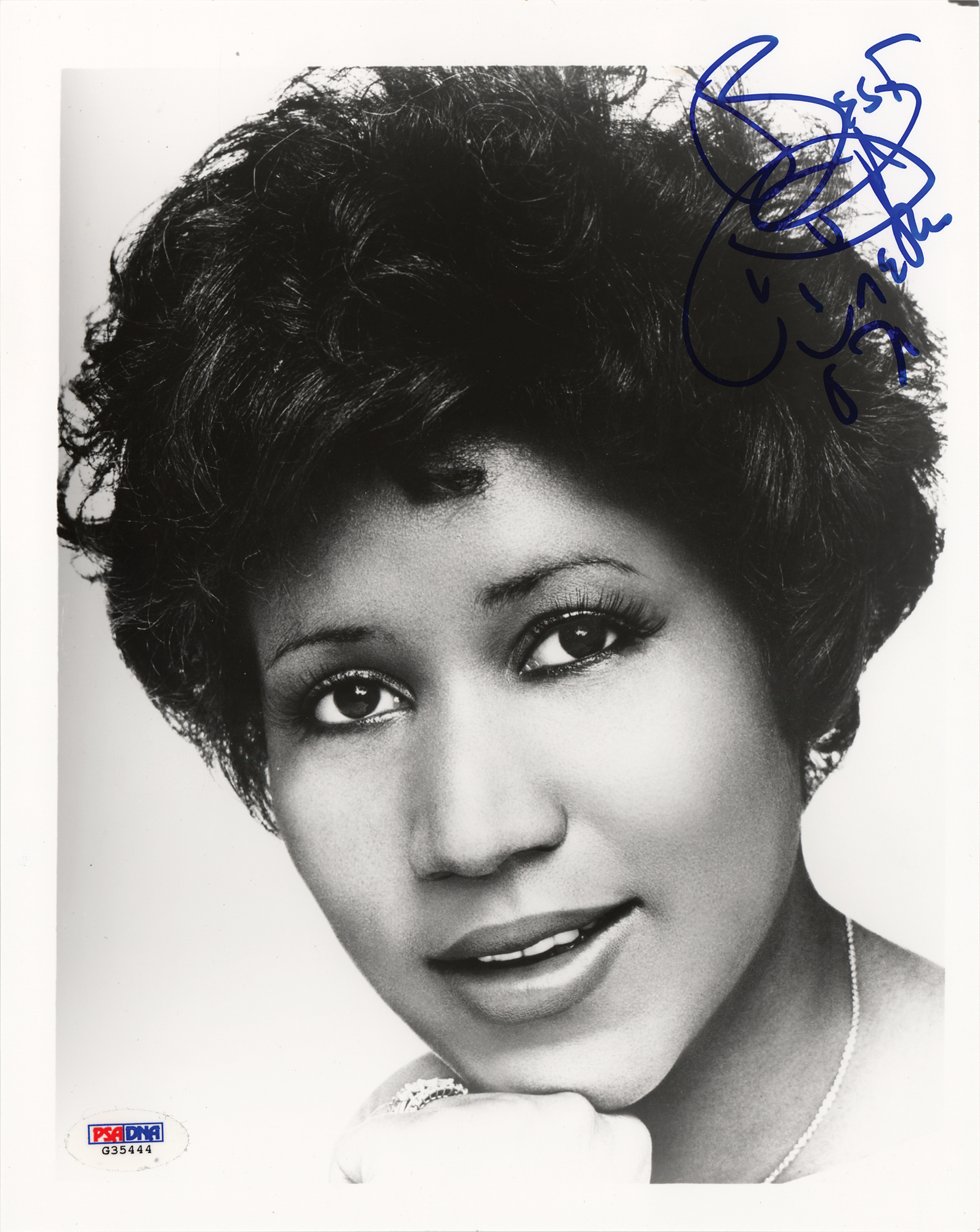 Glossy 8 x 10 close-up photo of the 'Queen of Soul,' signed in blue felt tip, "Best, Aretha, 07." In very fine condition, with a PSA/DNA label affixed to the lower left corner (certificate not present).