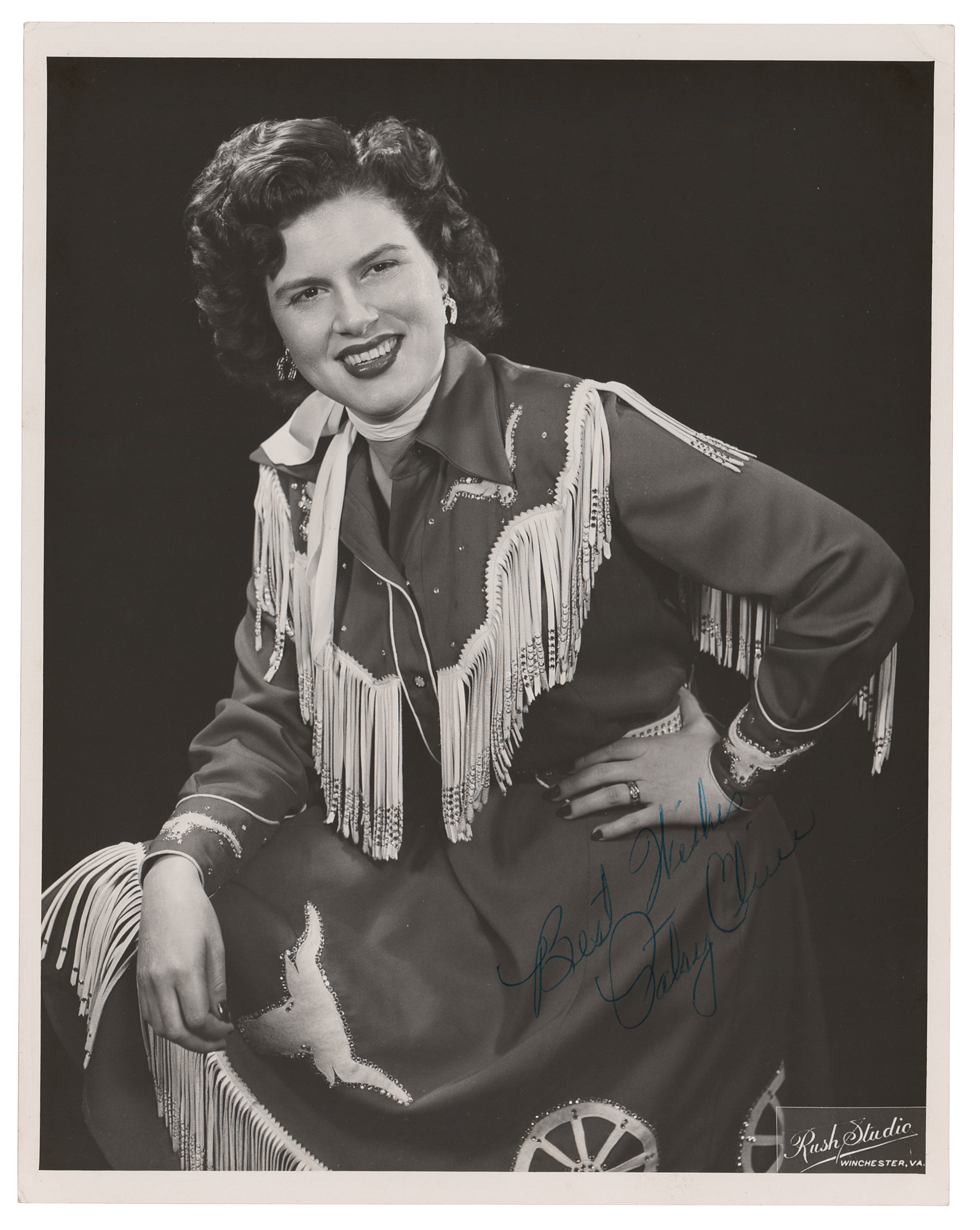 Vintage glossy 8 x 10.25 photo of Patsy Cline by the Rush Studio of Winchester, Virginia, signed in blue ballpoint, "Best wishes, Patsy Cline." In fine condition, with surface impressions on the signature area from another item signed on top of this one.