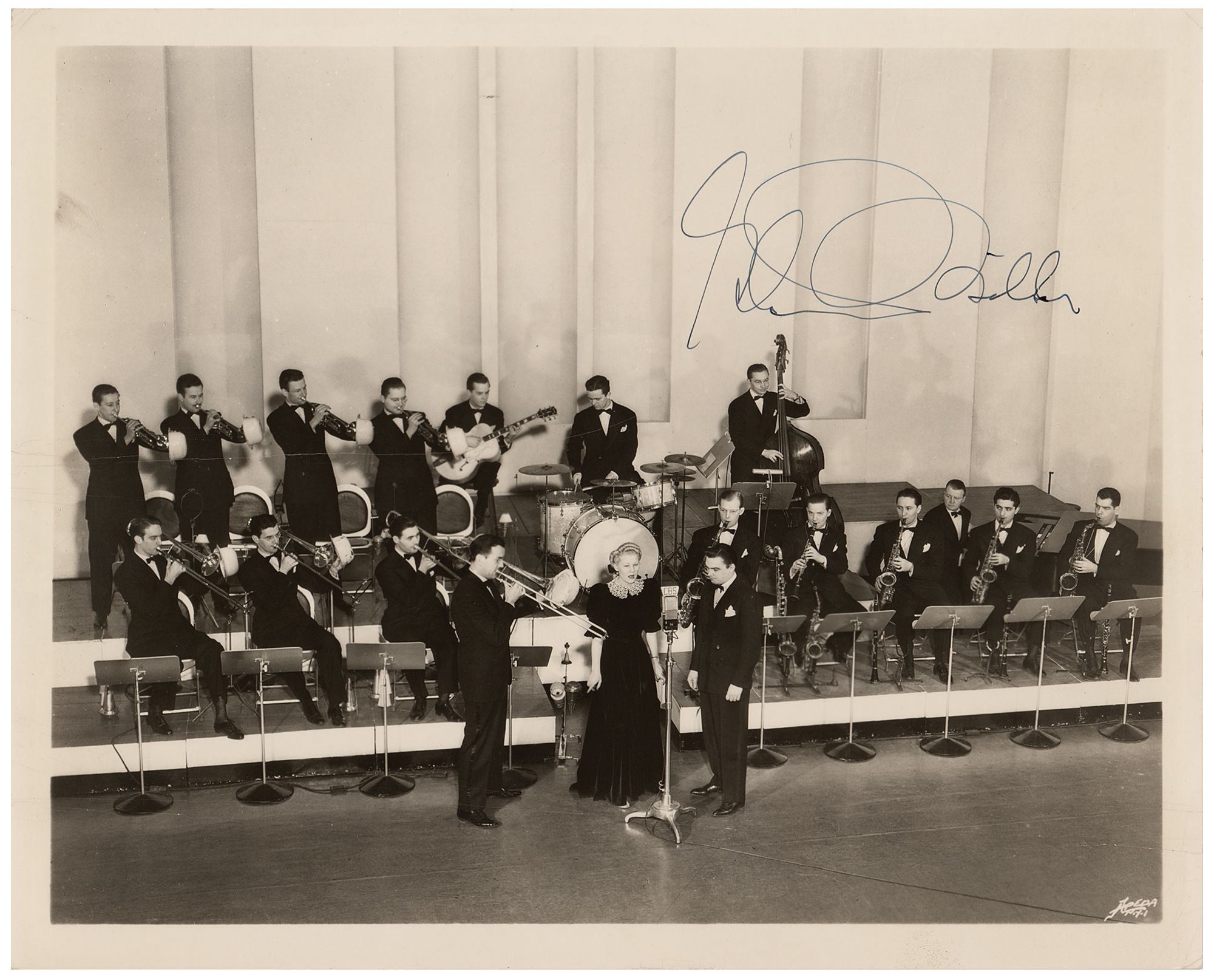 Vintage matte-finish 10 x 8 Apeda Studio photo of the Glenn Miller Orchestra during a performance, signed in fountain pen by the legendary trombonist. In very good to fine condition, with horizontal creasing across the left center, and heavier again at the bottom.