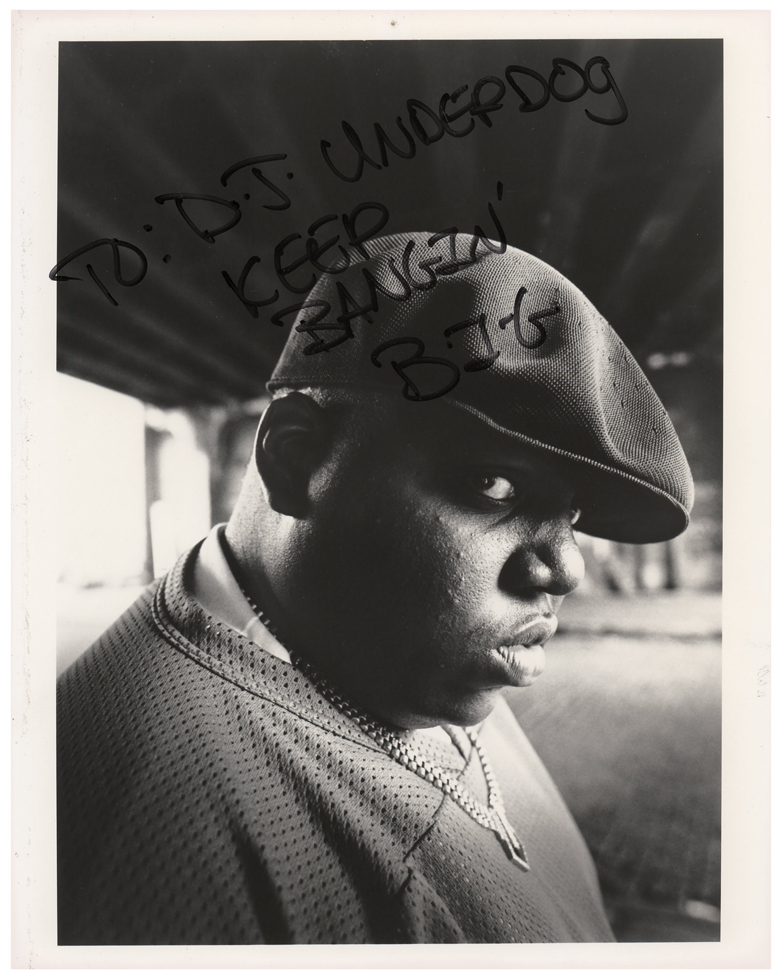 Hugely sought-after satin-finish 8 x 10 close-up photo of Biggie Smalls, signed and inscribed in black felt tip, "To: D.J. Underdog, Keep bangin', B.I.G.” In fine condition, with a single tack hole to upper border. Authentic signed photos of The Notorious B.I.G. are incredibly rare, with this example being the first we have ever offered.
