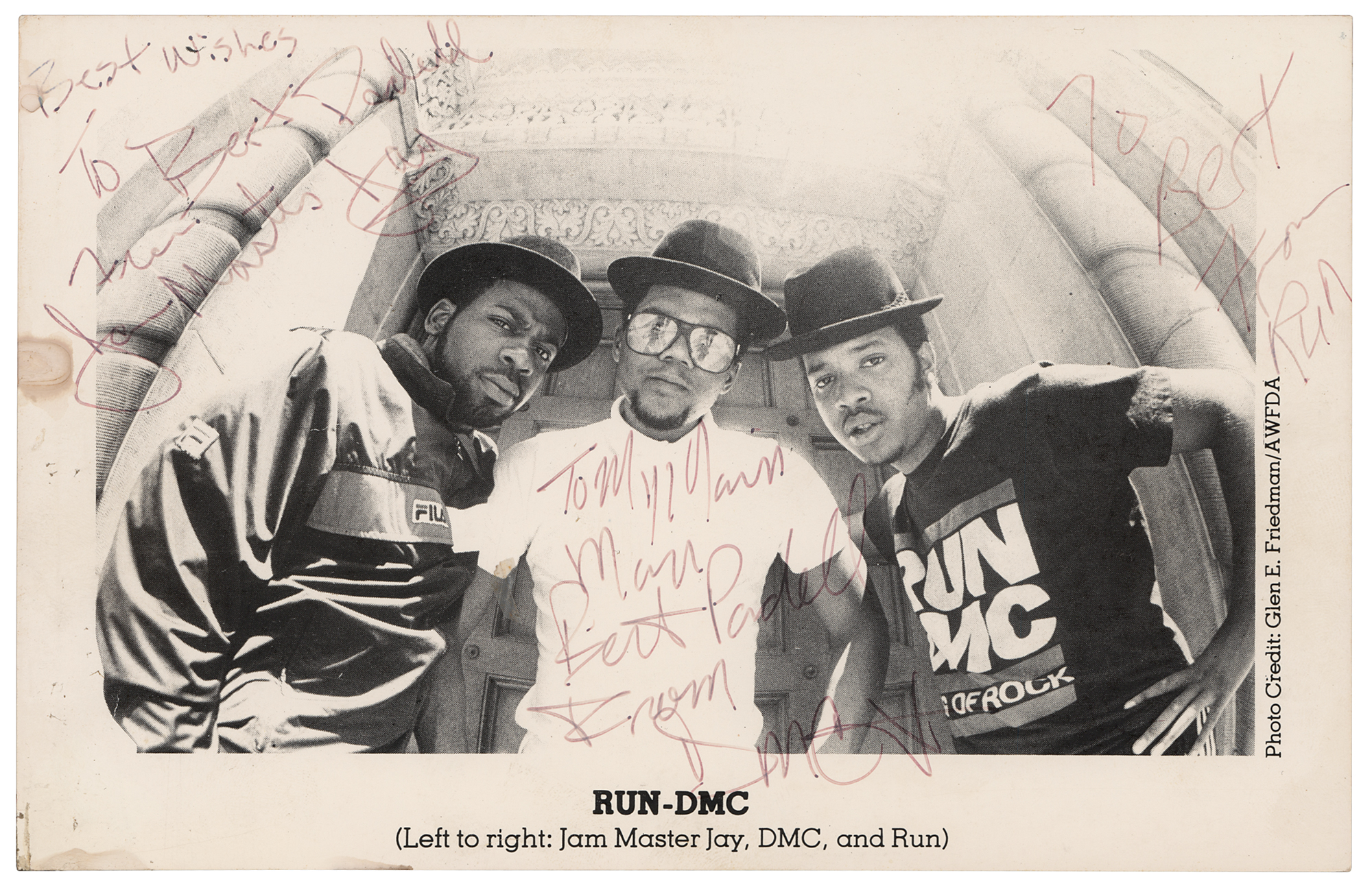 Sought-after glossy 8.5 x 5.5 publicity photo of New York City hip hop legends Run-DMC, signed and inscribed in black ink, "Best wishes to Bert Padell, from Jam Master Jay," "To my main man, Bert Padell, from DMC," and "To Bert, from Run.” In fine condition, with small stains in the left border, and light fading to the signatures.