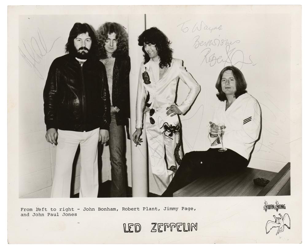 Vintage glossy 10 x 8 Swan Song publicity photo of Led Zeppelin posing together backstage, signed and inscribed in black ballpoint, “To Wayne, Best wishes, Robert Plant,” "John Bonham," "Jimmy Page," and "John Paul Jones." In very good condition, with noticeable overall creasing, and pen issues rendering Bonham and Page light, and Jones very faint. The consignor notes that his aunt worked at Swan Song and obtained the signatures for him at Madison Square Garden in 1977 as the band prepared for their performance. Vintage 8 x 10 photos signed in full by Led Zeppelin are few and far between.