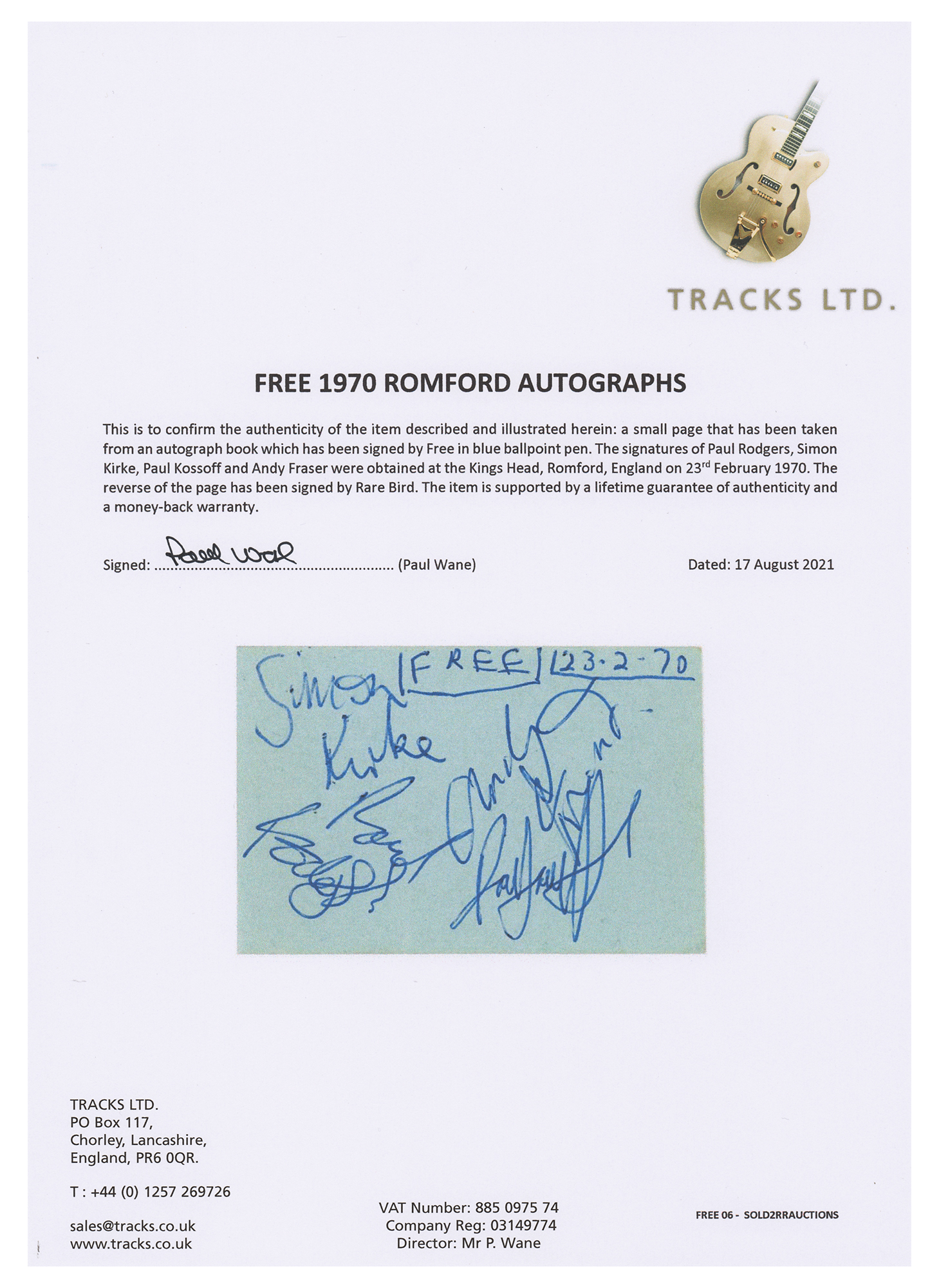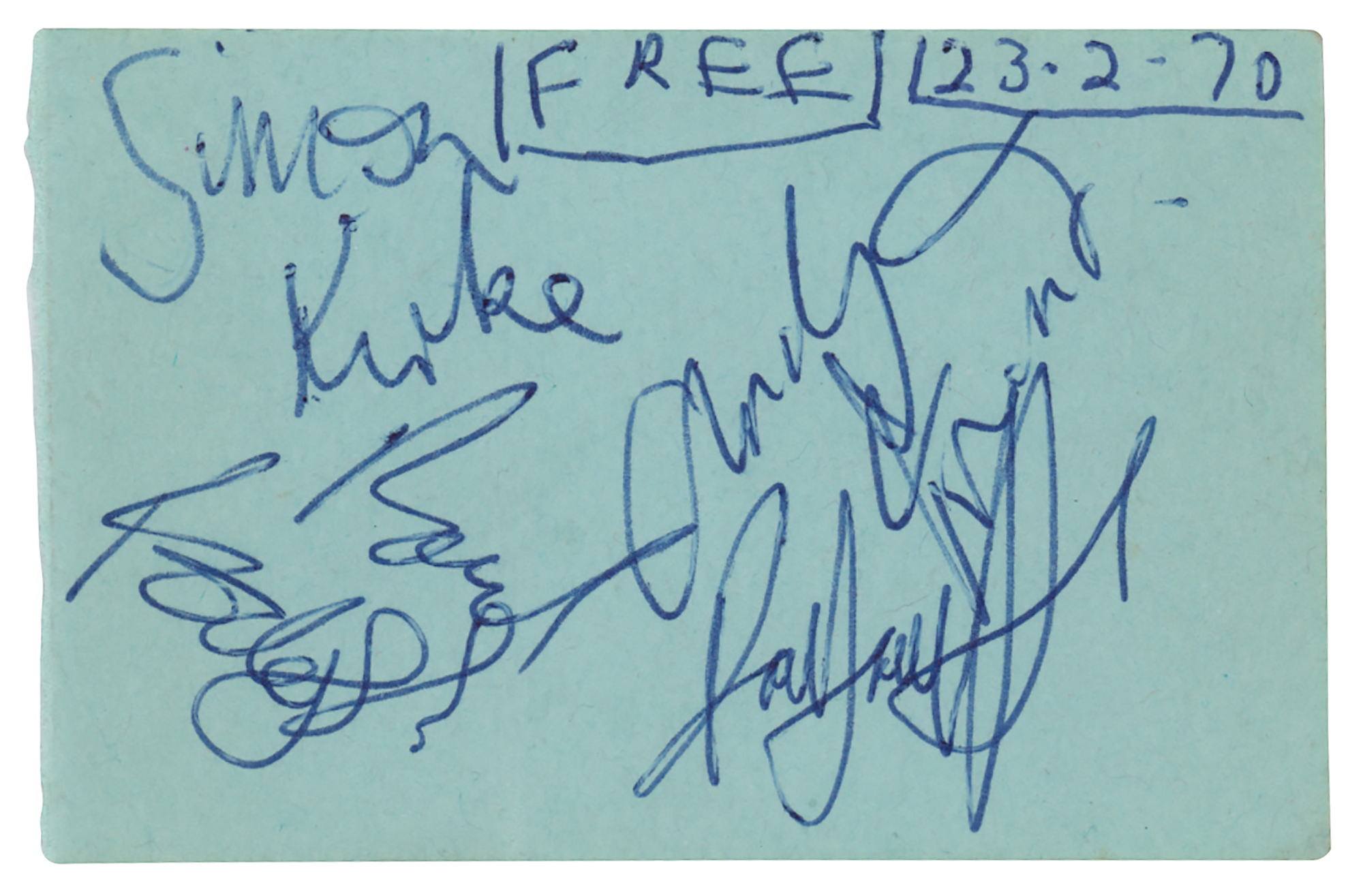 Ballpoint signatures of Free—“Paul Rodgers,” “Simon Kirke,” “Paul Kossoff,” and “Andy Fraser”—on a blue 3 x 2 sheet; the reverse of the page has been signed by Rare Bird members Steve Gould, David Kaffinetti, Graham Field, and Mark Ashton. In fine condition. Accompanied by a certificate of authenticity from Tracks.