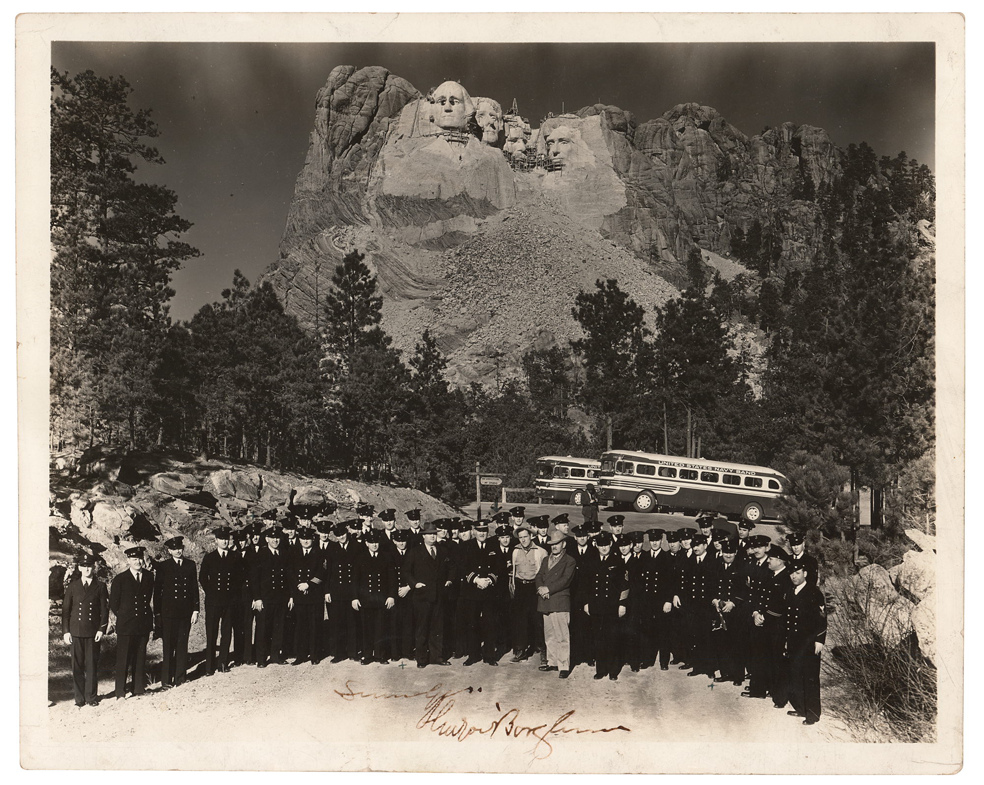 Vintage glossy 10 x 8 photo of Gutzon Borglum posing with the United States Navy band in front of Mount Rushmore, signed in fountain pen, "Sincerely, Gutzon Borglum." Reverse bears a Bell Photo stamp. In very good to fine condition, with scattered light creasing, and light silvering to the darker areas of the image.