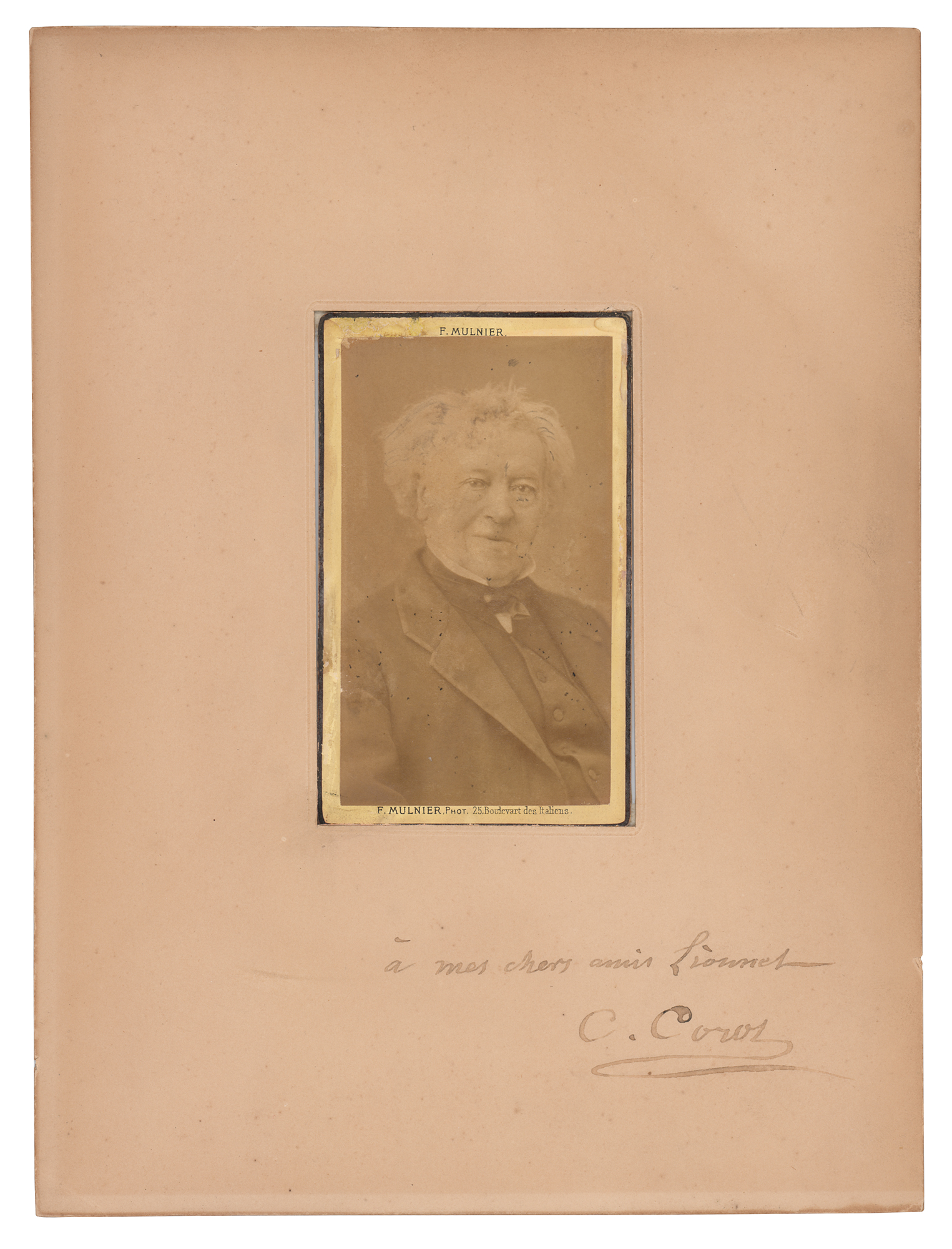 French landscape painter (1796-1875) identified with the Barbizon School. Ink signature and inscription, "A mes chers amis Lionel, C. Corot," on an off-white 7 x 9.5 mat displaying an original carte-de-visite portrait of Corot by F. Mulnier of Paris; mat opening is slightly larger than the carte-de-visite. In fine condition, with overall toning, and light silvering to the image.