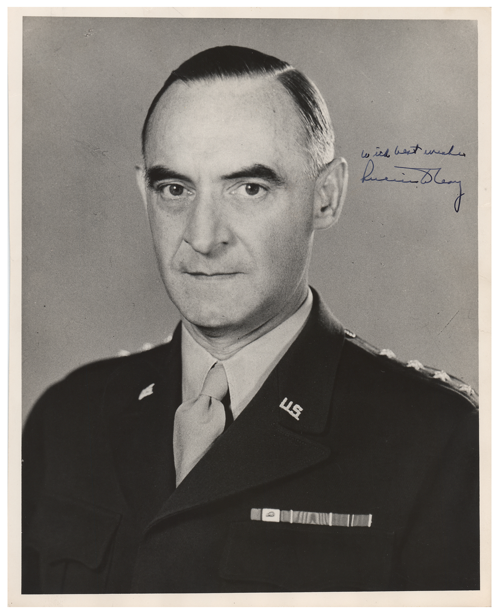 Vintage matte-finish 8 x 10 photo of General Clay in his four-star uniform, signed in fountain pen, "With best wishes, Lucius D. Clay." Reverse bears a U.S. Army Photograph stamp. In very good condition, with edge rippling and several heavy creases.