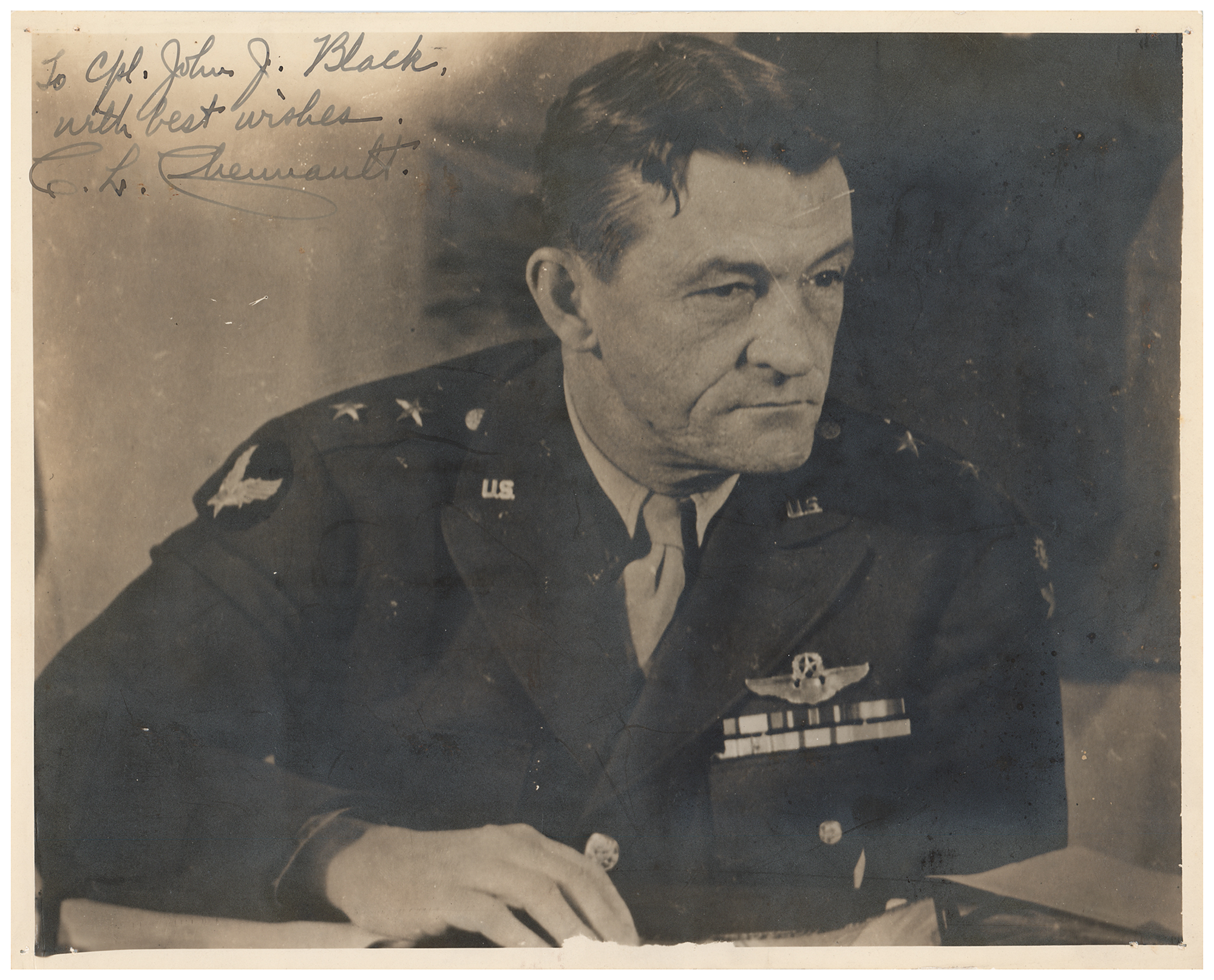Air Force general (1893-1958) who commanded the famous Flying Tigers during World War II. Vintage glossy 10 x 8 photo of Chennault in uniform, signed and inscribed in fountain pen, "To Cpl. John J. Black, with best wishes, C. L. Chennault.” In very good to fine condition, with scattered light creasing and surface impressions, and moderately heavy overall silvering.