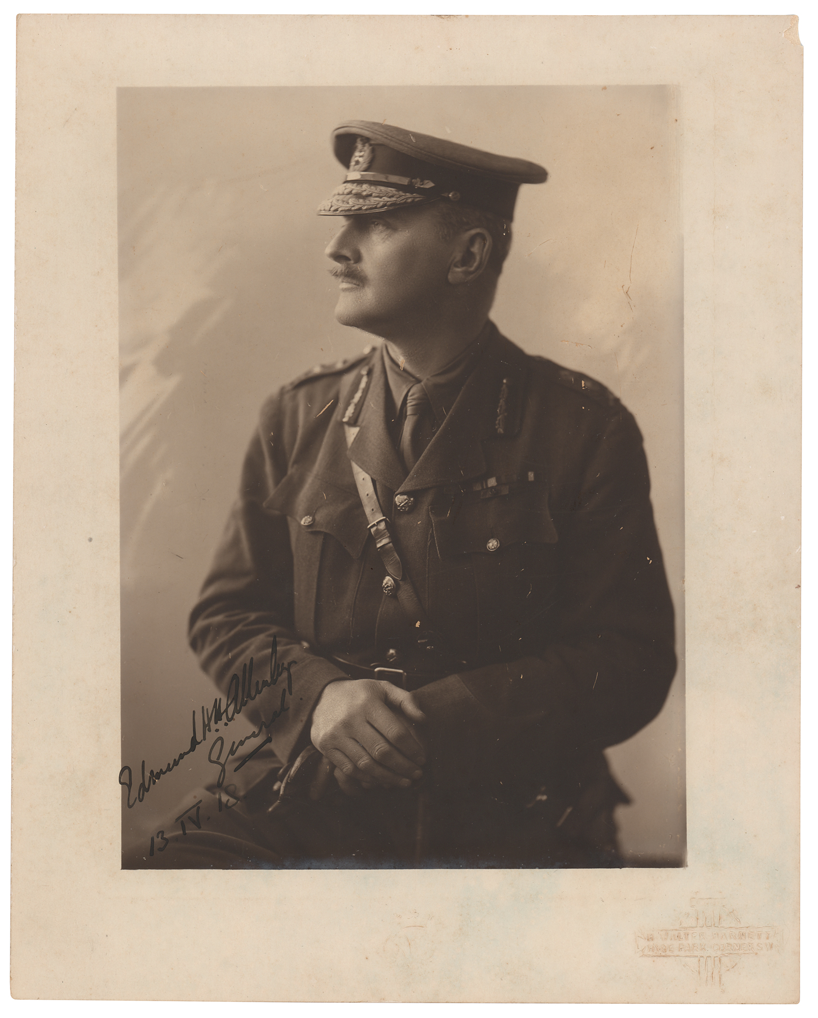 British soldier and administrator (1861-1936) most famous for his role during World War I, in which he led the Egyptian Expeditionary Force in the conquest of Palestine and Syria in 1917 and 1918. Vintage matte-finish 8 x 10 photo of Allenby in uniform by H. Walter Barnett & Co. Studio, signed in fountain pen, "Edmund H. H. Allenby, General, 13.IV.18." Blindstamped in the lower corner by the studio. In fine condition, with scattered small scratches.