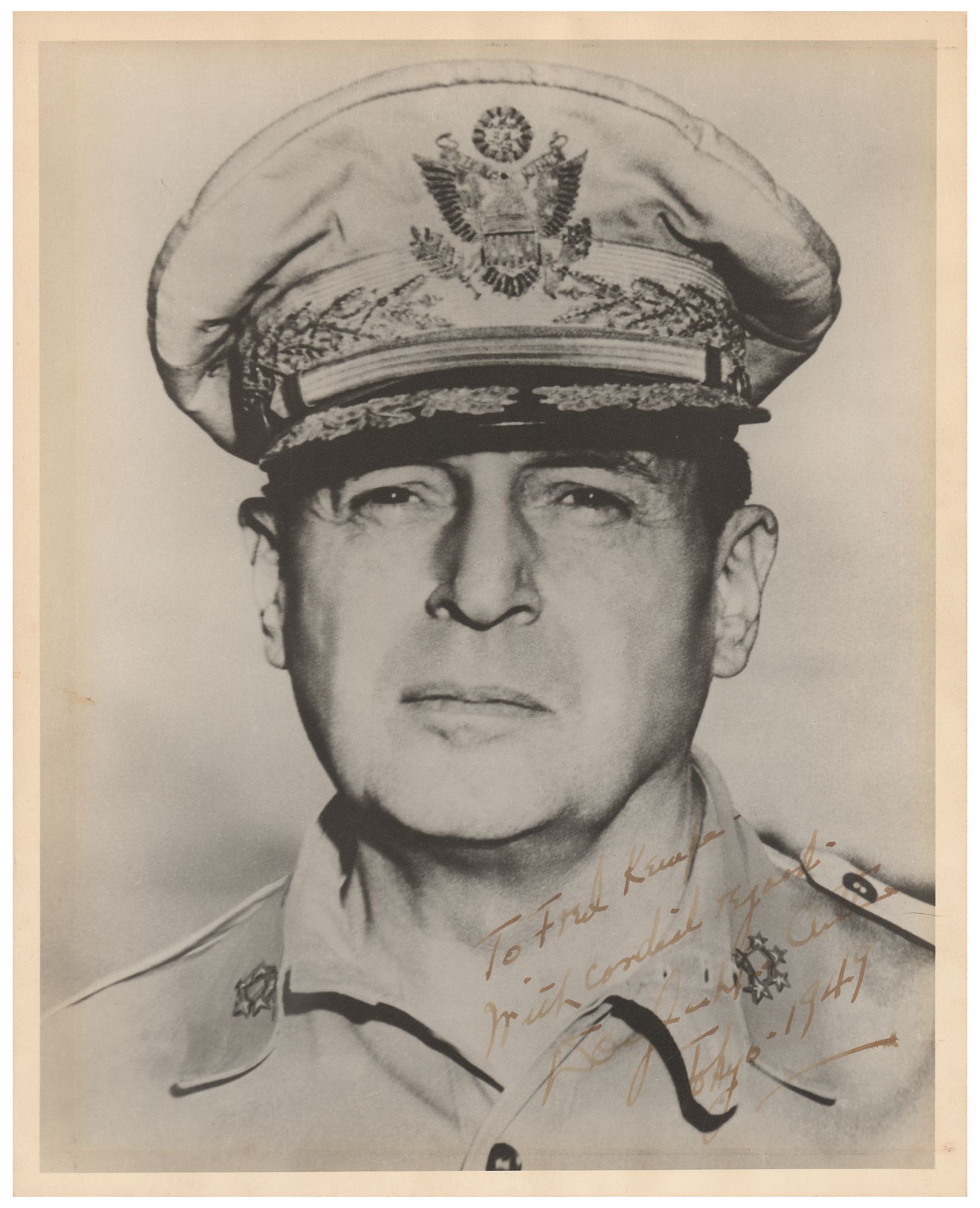 Vintage matte-finish 7.75 x 9.75 close-up photo of MacArthur in uniform, signed and inscribed in fountain pen, "To Fred Kemp, With cordial regard, Douglas MacArthur, Tokyo 1949.” In very good to fine condition, with toning and rippling to the edges. After WWII, MacArthur's headquarters were located in Tokyo, where he helped Japan to rebuild itself following the devastation of war. Overseeing this redevelopment, MacArthur was effectively the interim leader of Japan from 1945 to 1948; after handing over power to the Japanese government in 1948, MacArthur remained in Japan until relieved by President Harry S. Truman in 1951.