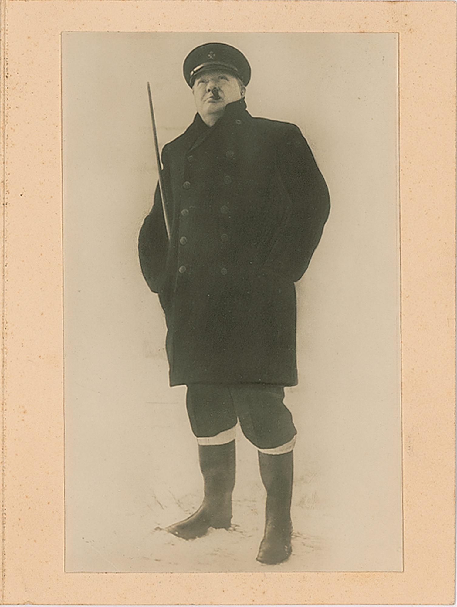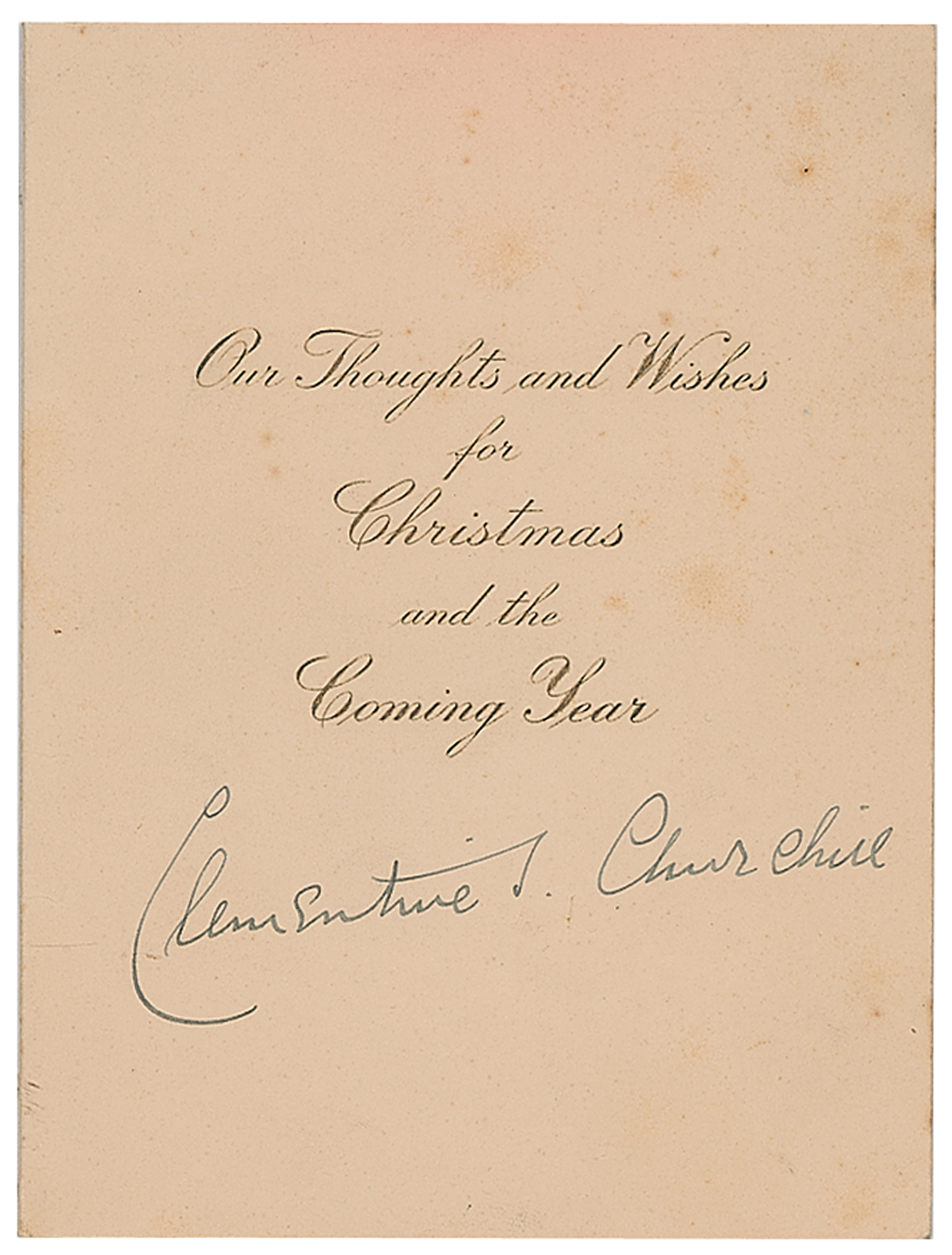 Two items: a vintage matte-finish photo of Clementine Churchill, affixed to the original 4 x 4.75 studio mount, signed on the mount in fountain pen, "Christmas wishes & many thanks for your kindness, Clementine S. Churchill"; and a vintage Christmas card with printed text on front, 4.5 x 6.25, signed on the front in fountain pen, "Clementine S. Churchill," with interior featuring a splendid full-length photo of Winston Churchill with warm coat, cigar, and cane. In overall very good to fine condition, with soiling to the photo, and scattered light foxing to the card.
