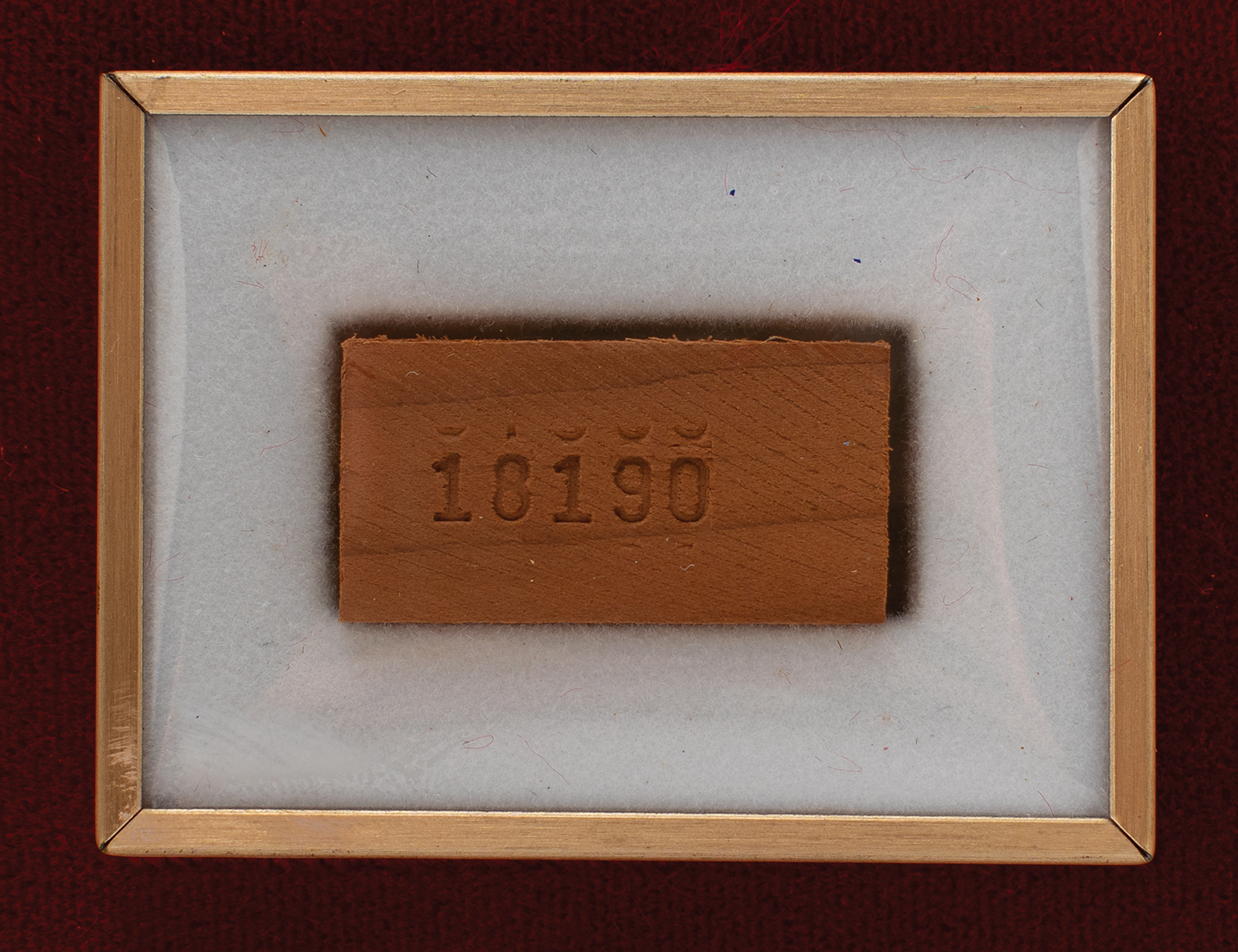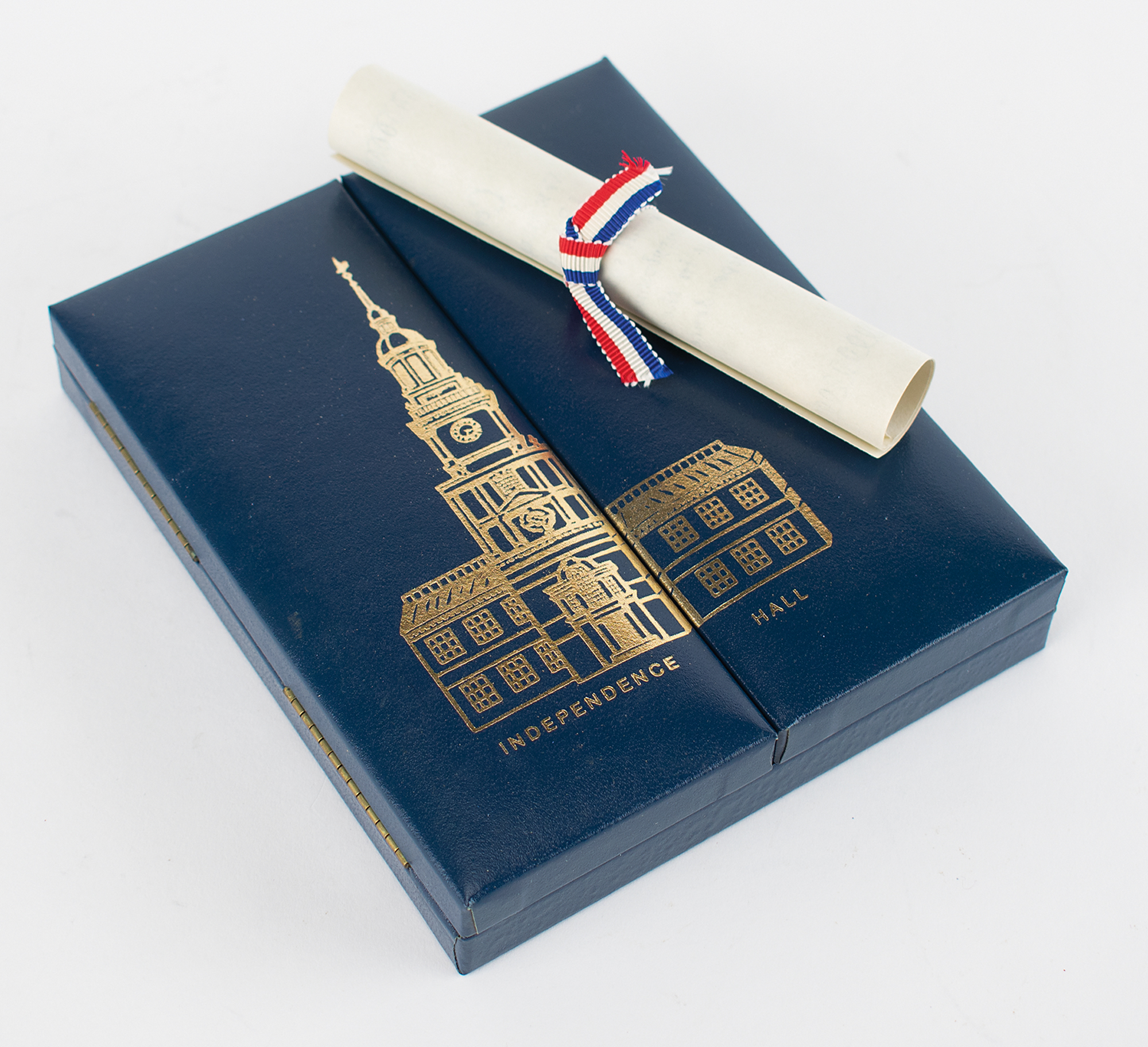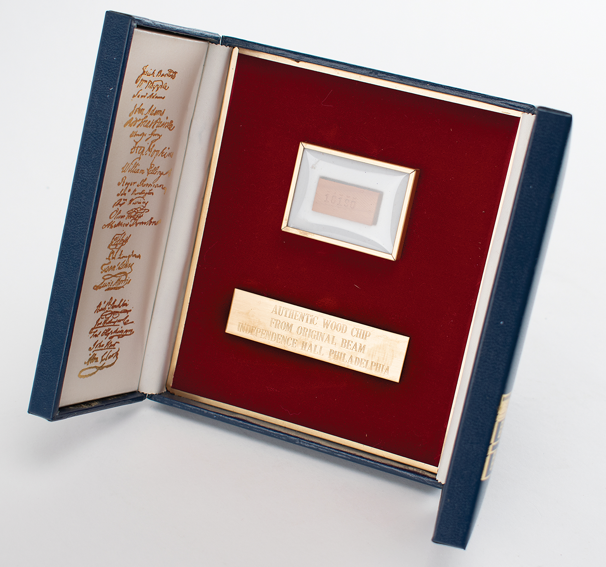 Limited edition display housing a .75 x .5 wood chip cut from the original cedar beams of Independence Hall in Philadelphia, numbered 18190 of an unspecified edition. Housed in a collector's case with identification plaque and gold facsimile signatures of some of the signers of the Declaration of Independence. Accompanied by the original box, booklet, and certificate from Burnes of Boston, who released the edition during the bicentennial year of 1976.