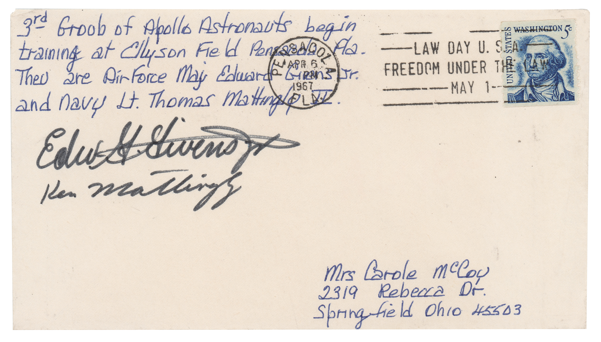 Rare early postal cover postmarked at Pensacola, Florida, on April 6, 1967, signed in black felt tip, "Edw. G. Givens, Jr." and "Ken Mattingly." Collector's notations to upper left read: "3rd Group of Apollo Astronauts begin training at Ellyson Field Pensacola, Fla. They are Air Force Maj. Edward Givens Jr. and Navy Lt. Thomas Mattingly." In fine condition. Givens, a reluctant signer, was killed in an automobile accident on June 6, 1967, before being assigned to a prime or backup spaceflight crew, making his one of the toughest astronaut signatures to acquire. In his article 'The Rarest of them All,' noted collector Bob McLeod rates Givens's signature as 'perhaps the rarest of all NASA astronauts.'