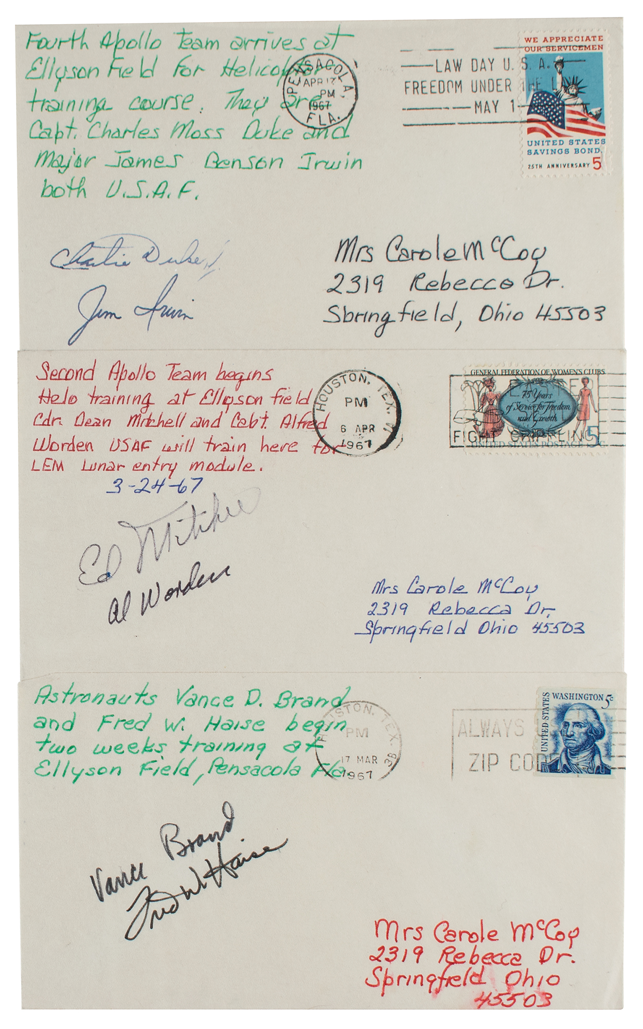 Collection of three postal covers, each postmarked at Houston or Pensacola in March-April 1967, signed in felt tip or ballpoint by pairs of astronauts from NASA Astronaut Group 5 as they went to Ellyson Field for training, including: Charlie Duke and Jim Irwin; Edgar Mitchell and Al Worden; and Vance Brand and Fred Haise. All bear lengthy collector's notations identifying the signers. In overall fine condition.