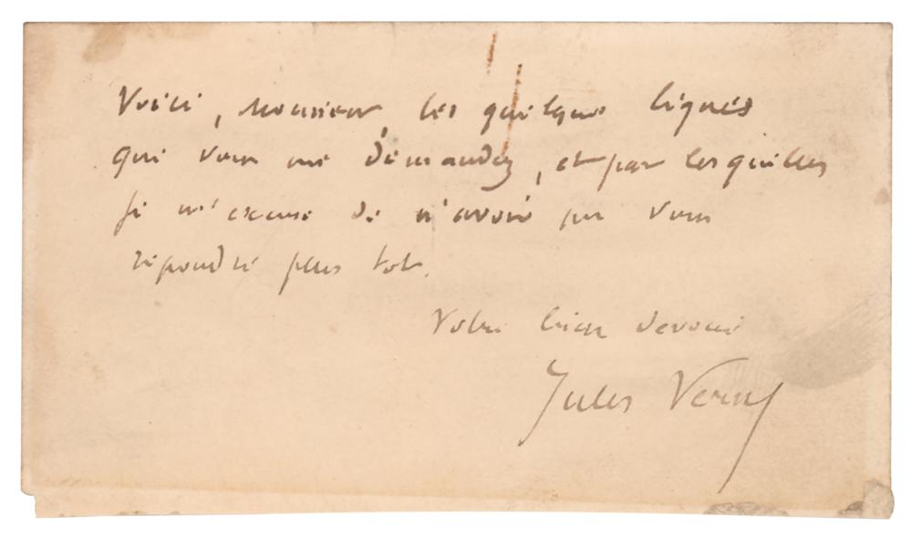 ANS in French, signed “Jules Verne,” penned on a 3.5 x 2 card, no date. Brief untranslated handwritten note by the visionary science fiction author. In very good to fine condition, with light soiling, a small stain, and a rusty paperclip impression to the top edge.