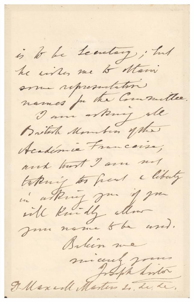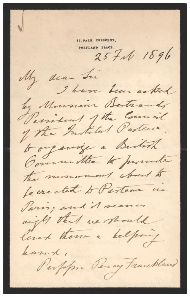 ALS, one page both sides, 4.5 x 7, black-bordered personal letterhead, February 25, 1896. Handwritten letter to English botanist and taxonomist Maxwell T. Masters, in part: "I have been asked by Monsieur Bertrand, President of the Council of the Institut Pasteur, to organize a British Committee to promote the monument about to be erected to Pasteur in Paris; and it seems right that we should lend them a helping hand. Professor Percy Frankland is to be secretary?I am asking all British members of the Academie Francaise, and trust I am not taking too great a liberty in asking you if you will kindly allow your name to be used." In fine condition.