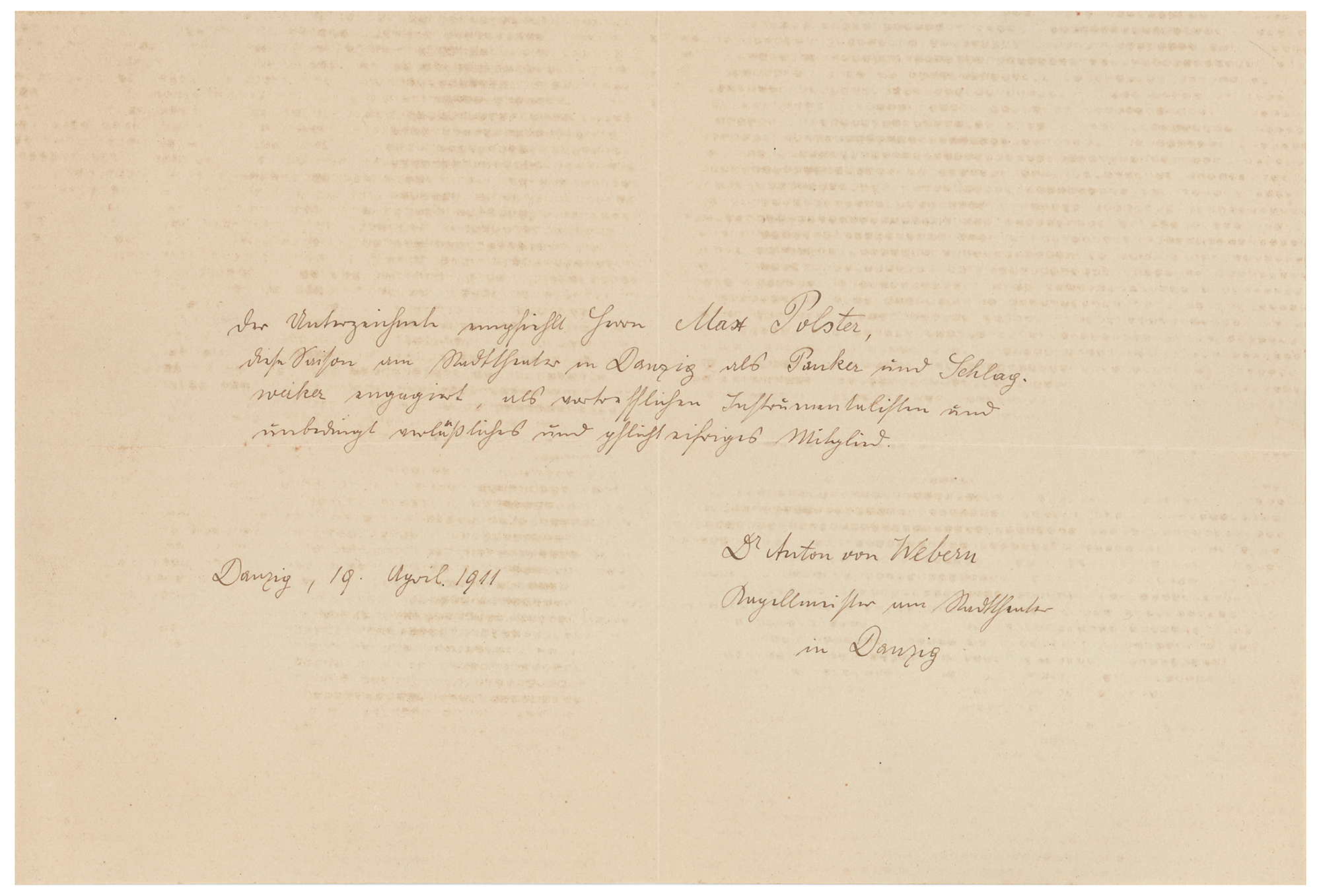 Austrian composer and conductor (1883-1945) who was one of the best-known exponents of Schoenberg's twelve-tone technique. ALS in German, signed “Dr. Anton von Webern,” one page, 10 x 6.75, April 19, 1911. Handwritten letter of reference for timpanist Max Polster, stating that Polster performed as timpanist and percussionist at the Stadttheater in Danzig, adding that he is "an excellent instrumentalist and an absolutely reliable and zealous member." In fine condition, with show-through from magnetic photo album residue on the reverse.