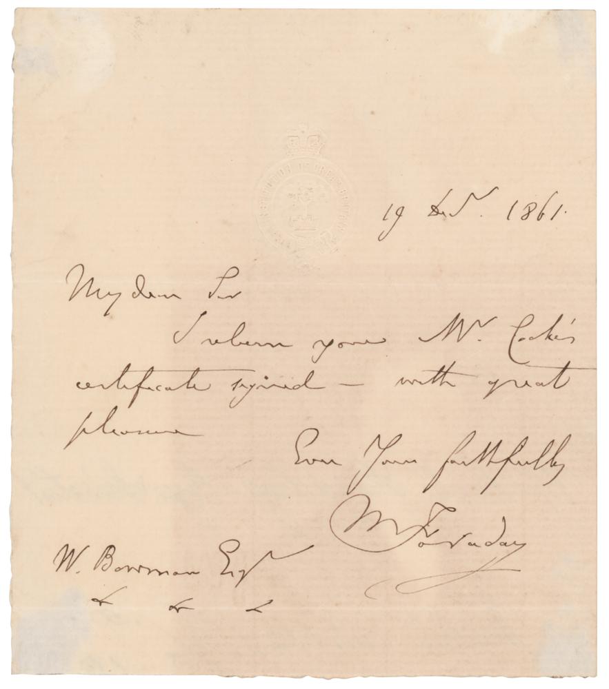 British physicist and chemist (1791-1867) best known for his development of the first dynamo and the discovery of electromagnetic induction. ALS signed “M. Faraday,” one page, 4.5 x 5, embossed Royal Institution of Great Britain letterhead, December 19, 1861. Handwritten letter to "W. Bowman," in full: "I return you Mr. Cooke's certificate signed—with great pleasure." In fine condition, with light irregular toning. Accompanied by an engraved portrait.