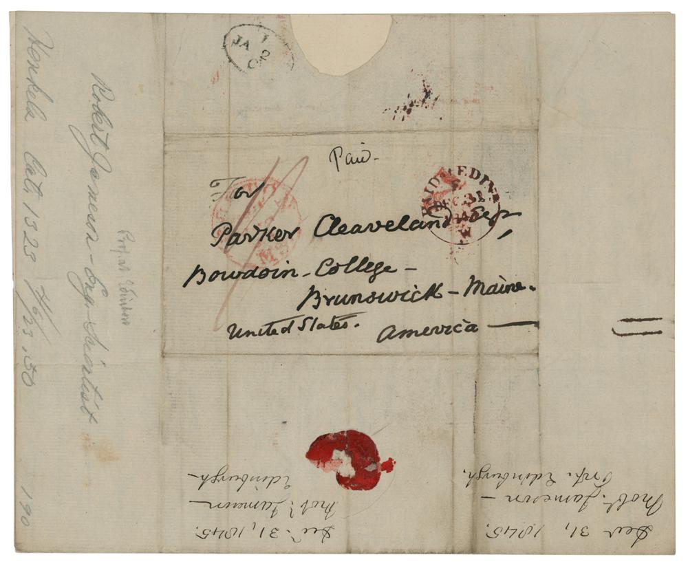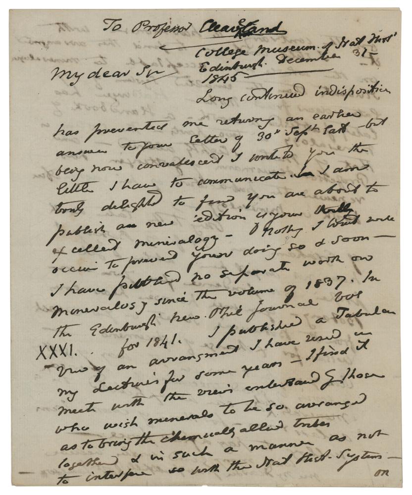 Scottish naturalist and mineralogist (1774-1854) remembered as a teacher of Charles Darwin and for building Great Britain's second-largest collection of zoological and geological specimens for the Museum of Edinburgh University. ALS signed “Rob't Jameson,” one page both sides, 7 x 8.75, December 31, 1845. Handwritten letter to American geologist Parker Cleaveland at Bowdoin College, discussing geological classifications systems. In part: "I am truly delighted to find you are about to publish a new edition of your?Mineralogy?I have published no separate work on minerals since the volume of 1837. In the Edinburgh New Phil. Journal Vol. XXXI for 1841, I published a tabular view of an arrangement I have used in my Lectures for some years?I still continue to find this arrangement on the whole more acceptable to mineralogical students than the unaltered system of my late dear friend Mohs—Haidinger has lately published a work, a Handbook of Mineralogy in two parts—the system is that of Mohs slightly altered." He goes on to request "good specimens of American minerals such as can be exhibited in a classroom." Addressed on the integral leaf in Jameson's hand. In fine condition, with slightly irregular light toning.