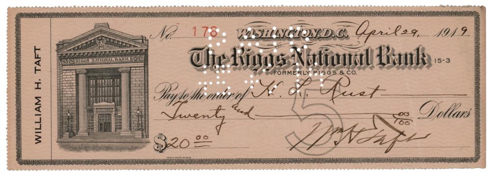 Personal check, 8.25 x 3, filled out in another hand and signed by Taft, "Wm. H. Taft," payable to H. L. Rust for $20, April 29, 1919. In fine condition.