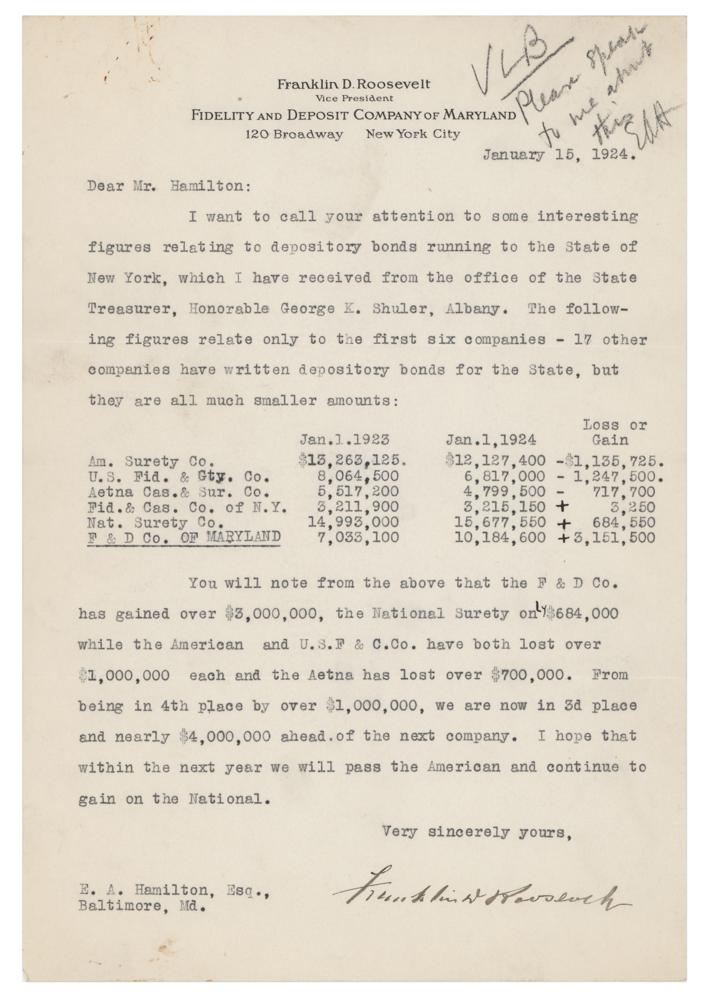 TLS, one page, 7.25 x 10.5, personal Fidelity and Deposit Company of Maryland letterhead, January 15, 1924. Letter to friend and business associate Colonel Edgar A. Hamilton, in part: "I want to call your attention to some interesting figures relating to depository bonds running to the State of New York, which I have received from the office of the State Treasurer, Honorable George K. Shuler, Albany. The following figures related only to the first six companies-17 other companies have written depository bonds for the State, but they are all much smaller amounts?You will note from the above that the F & D Co. has gained over $3,000,000, the National Surety only $684,000 while the American and U.S.F. & C. Co. have both lost over $1,000,000 each and the Aetna has lost over $700,000. From being in 4th place by over $1,000,000, we are now in 3rd place and nearly $4,000,000 ahead of the next company. I hope that within the next year we will pass the American and continue to gain on the National." In fine condition.