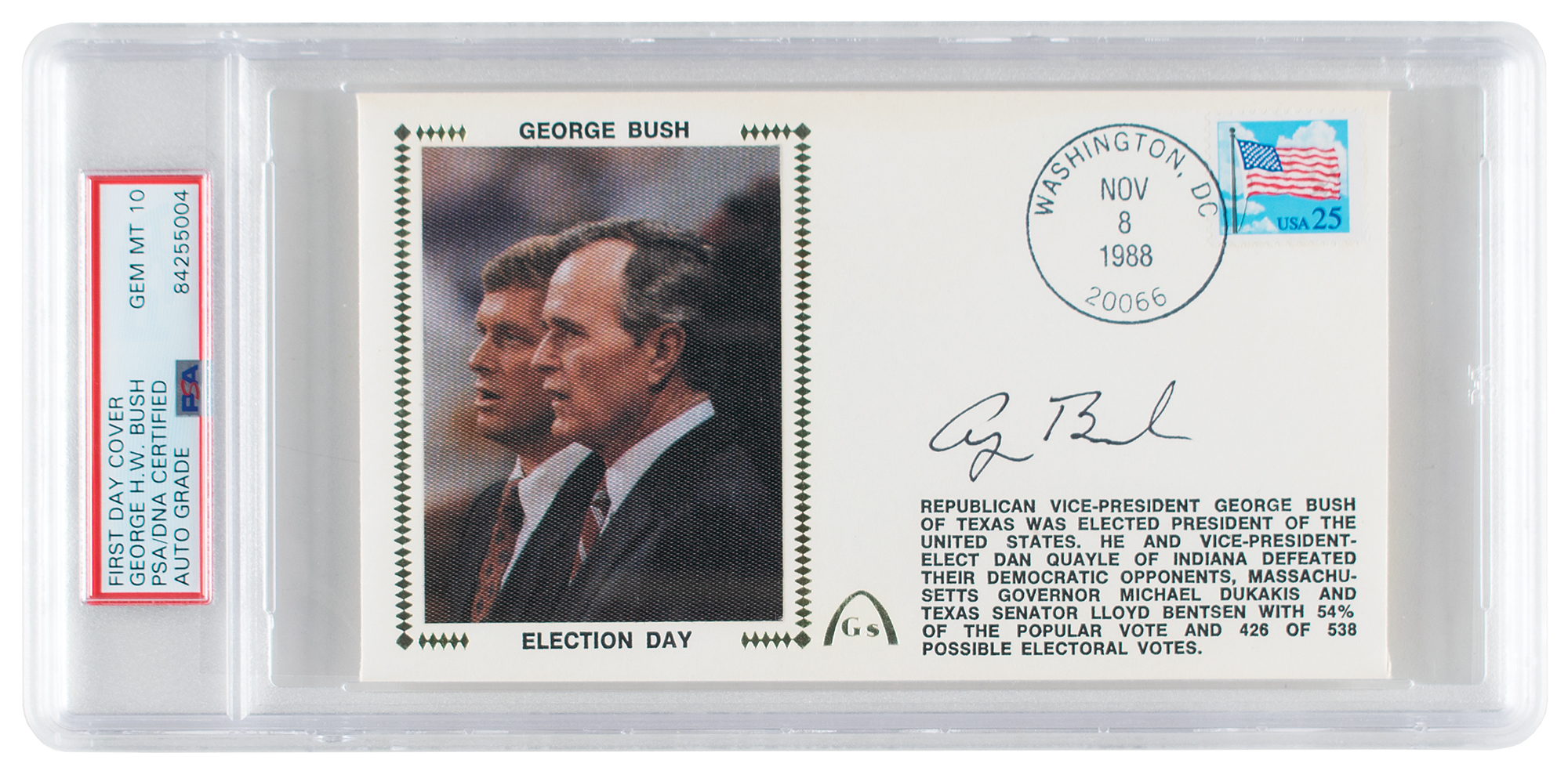 Election Day Gateway cover with a silk cachet honoring Republican candidates and eventual winners George Bush and Dan Quayle, postmarked at Washington, D.C. on November 8, 1988, signed in black ink by Bush. In fine condition. Encapsulated in a PSA/DNA authentication holder, grading the autograph as "GEM MT 10."