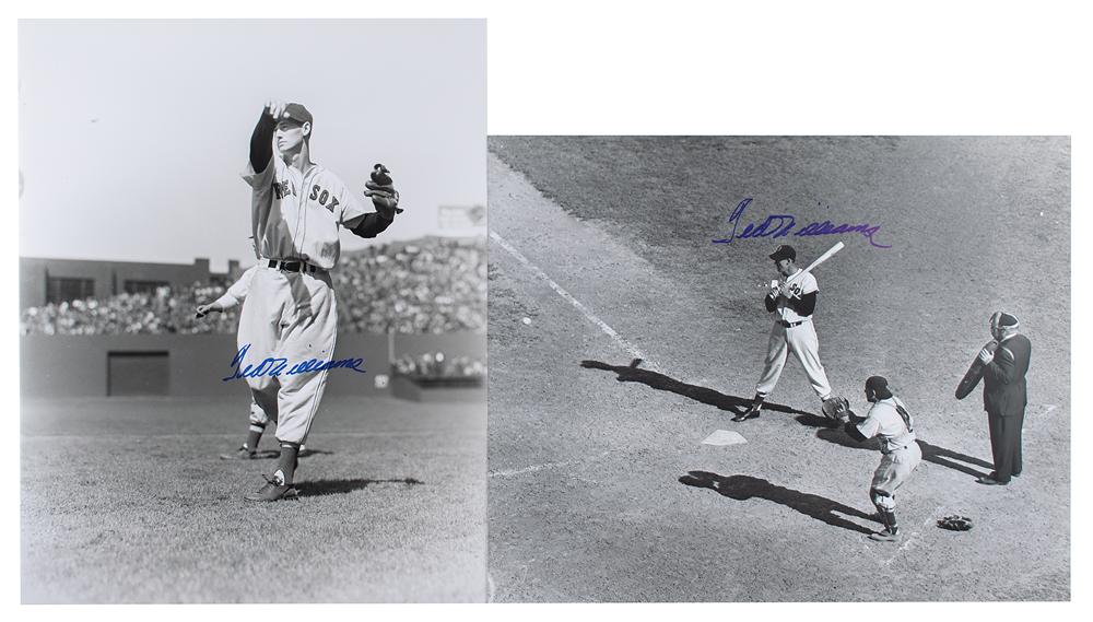 Very displayable pair of oversized semi-glossy photos of Boston Red Sox great Ted Williams, 16 x 20 and 20 x 16, both signed neatly in blue felt tip. In overall fine condition.