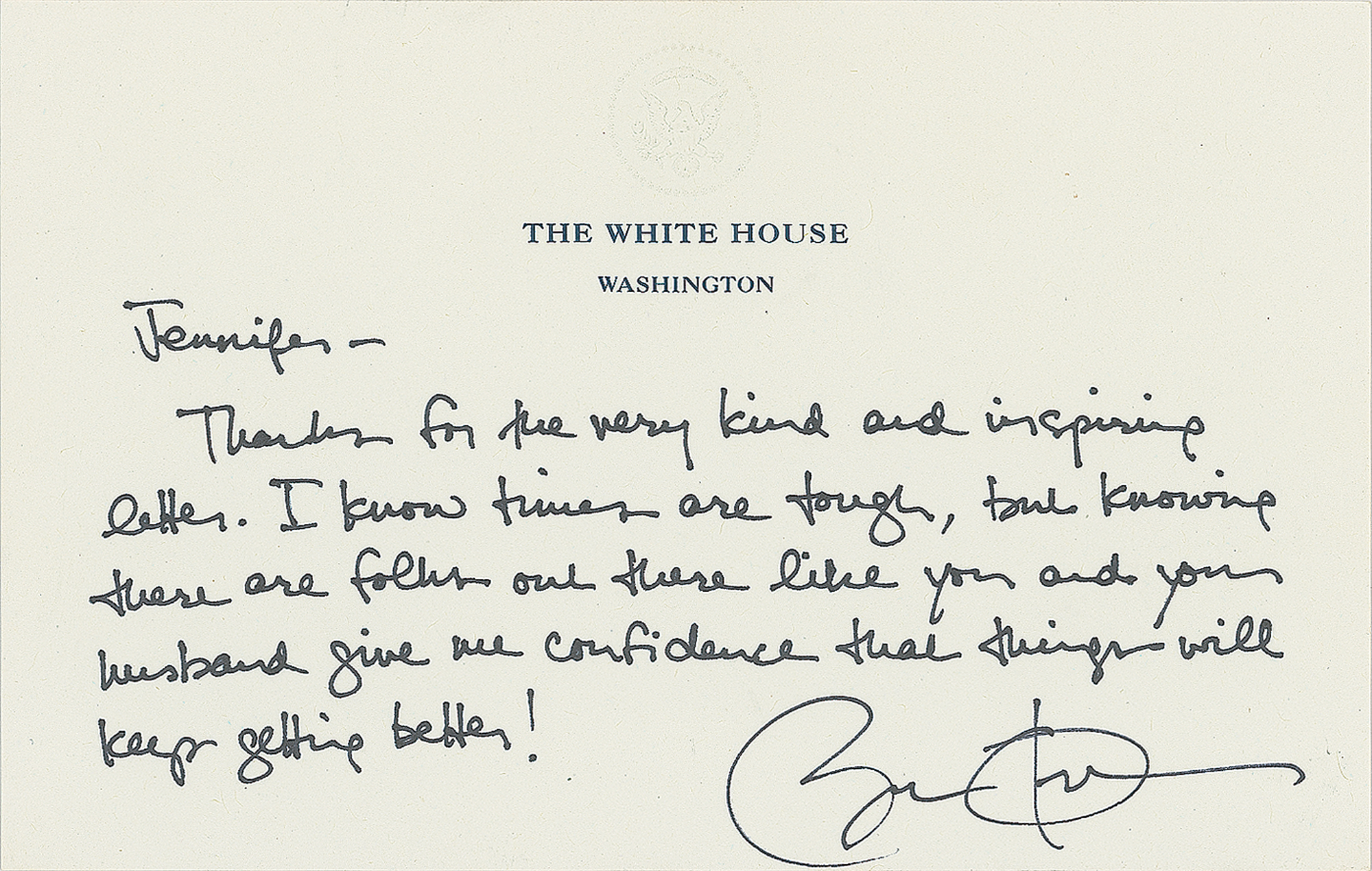 Rare ALS as president, one page, 6.5 x 4, White House stationery card, postmarked January 11, 2010. Handwritten letter to Jennifer Cline, in full: "Thanks for the very kind and inspiring letter. I know times are tough, but knowing there are folks out there like you and your husband give me confidence that things will keep getting better!" In very fine condition. Accompanied by the original White House mailing envelopes, as well as a copy of a Huffington Post article from November 2, 2010, which lends background on the recipient, Jennifer Cline, and the original sale of the letter.