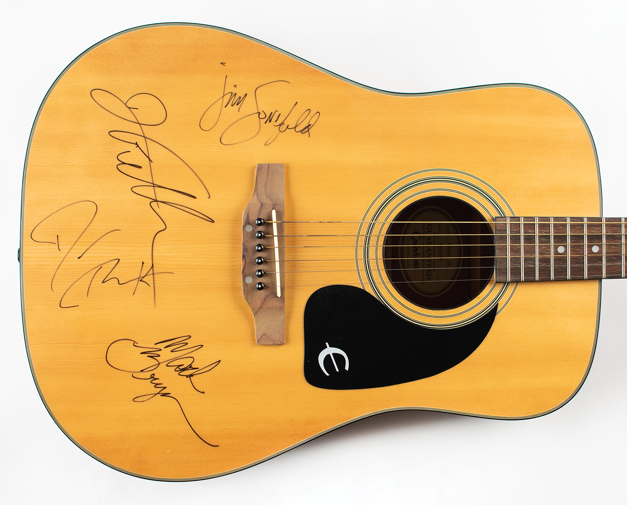 Handsome Gibson Epiphone acoustic guitar with a natural finish, signed on the body in black felt tip by Darius Rucker, Mark Bryan, Dean Felber, and Jim Sonefeld. In fine condition. Accompanied by a Freedom hardshell carrying case by SKB.