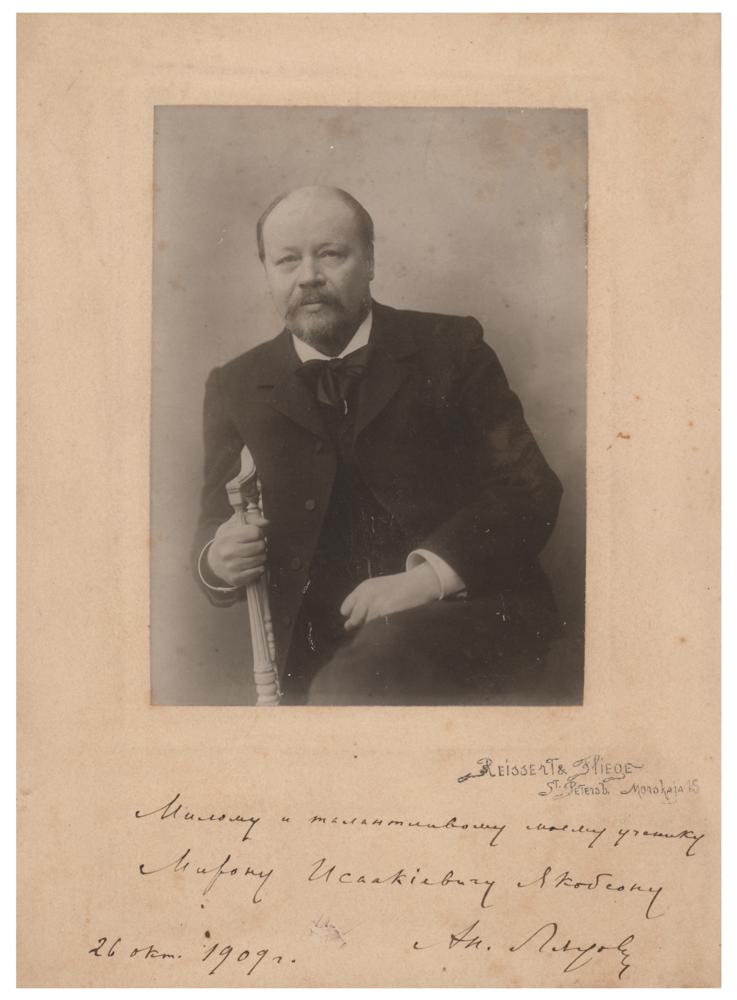 Esteemed Russian composer, teacher, and conductor (1855-1914). Matte-finish 4.25 x 5.75 portrait of the composer by Reissert & Fliege of St. Petersburg, Russia, affixed to its original 6.75 x 9.25 mount, inscribed on the mount in ink in Cyrillic by Lyadov, and signed and dated below, "An. Lyadov, 26 Okt. 1909." In very good to fine condition, with light soiling to the mount, and a small tear between the date and the signature.