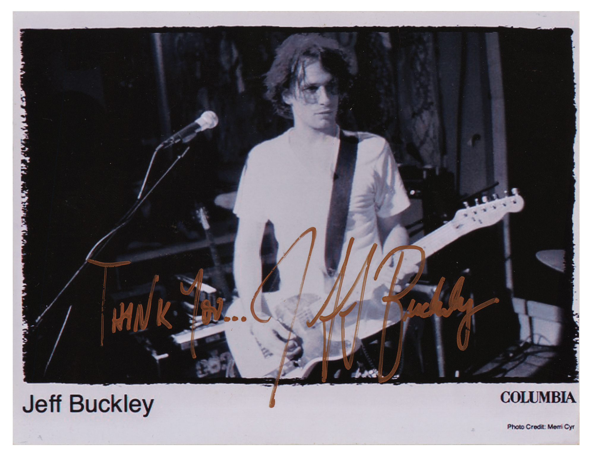Color glossy 6.25 x 4.75 photo of Buckley playing the guitar, signed in gold ink, "Thank you?Jeff Buckley." In fine condition.