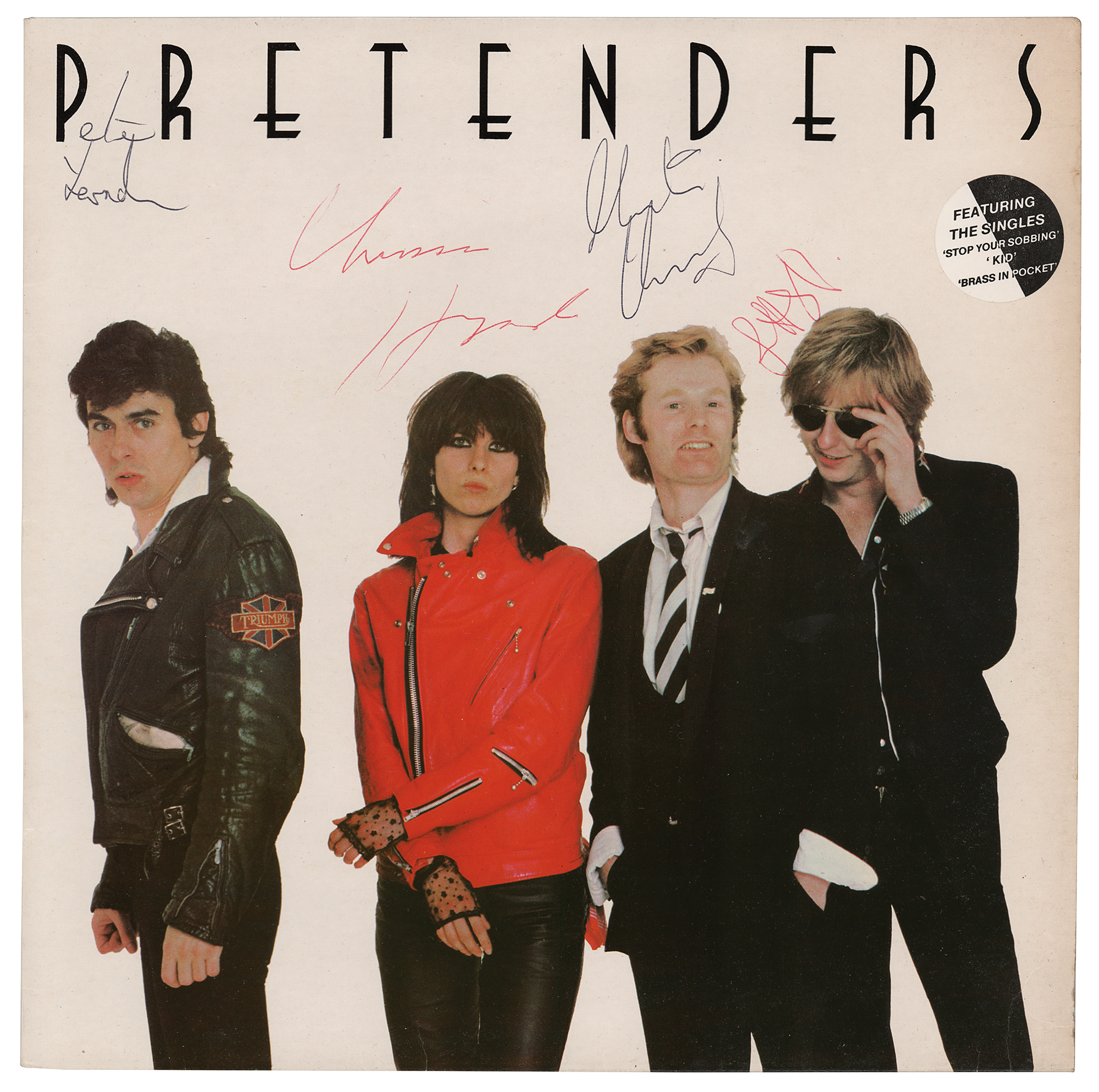Self-titled debut album by The Pretenders, signed on the front cover in red ballpoint by Chrissie Hynde and James Honeyman-Scott, and in black ballpoint by Martin Chambers and Pete Farndon. In fine condition. The record is not included.