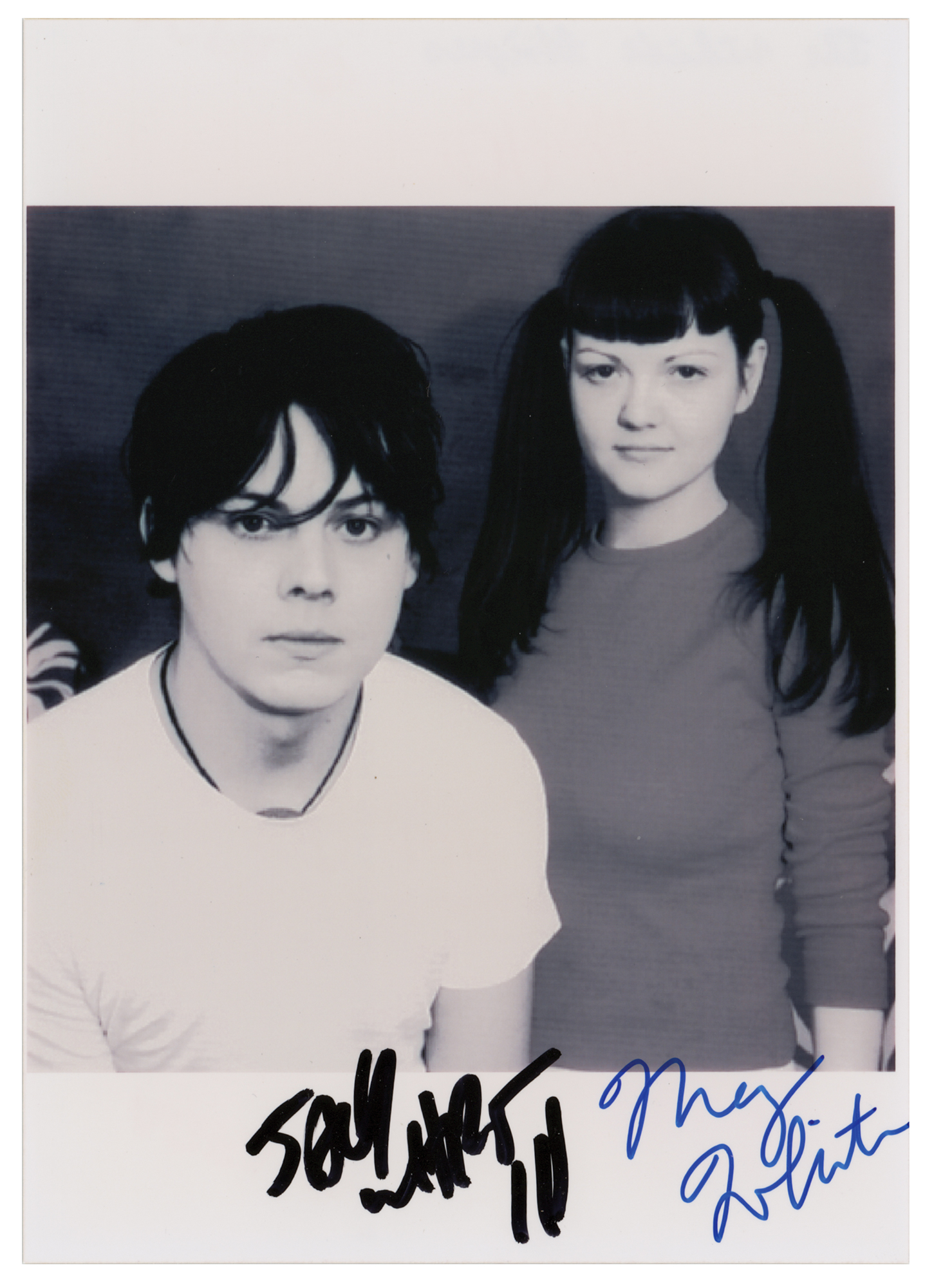 Glossy 5 x 7 photo of The White Stripes early in their career, signed in black and blue felt tip by Jack and Meg White. In very fine condition.