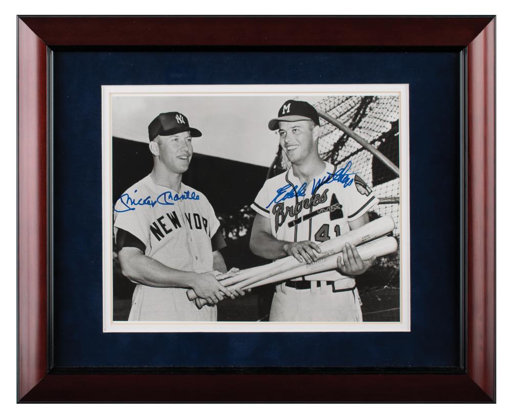Glossy 9.75 x 7.75 photo of the New York Yankees and Atlanta Braves Hall of Fame players posing with a cluster of baseball bats, signed in blue felt tip by Mickey Mantle and Eddie Mathews. Double-matted and framed to an overall size of 16.25 x 13. In fine condition. Accompanied by a full letter of authenticity from PSA/DNA.