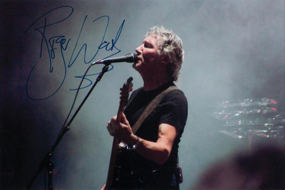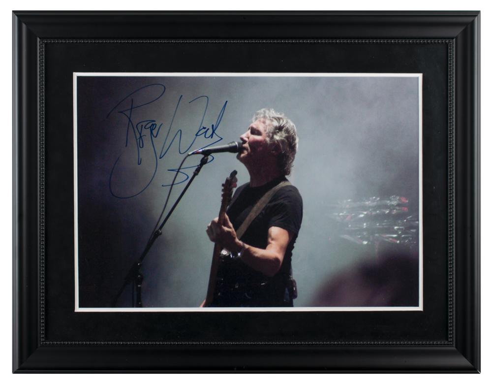 Large color semi-glossy 18 x 12 photo of Roger Waters during a live performance, signed prominently in blue felt tip. Double-matted and framed to an overall size of 25 x 19. In fine condition, with slightly grainy quality to the image.