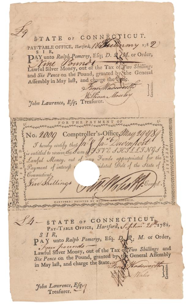 Three partly-printed early American documents from the state of Connecticut, including: a war-dated pay order for £4, signed by Fenn Wadsworth, Eleazer Wales, and Jedediah Huntington, September 20, 1781; a war-dated pay order for £9, signed by Fenn Wadsworth, Eleazer Wales, and Jedediah Huntington, February 18, 1782; and a comptroller's office draft for five shillings, signed by Oliver Wolcott, Jr., May 29, 1789. In very good to fine condition, with a few edge tears and a cancelation hole to Wolcott's signature.