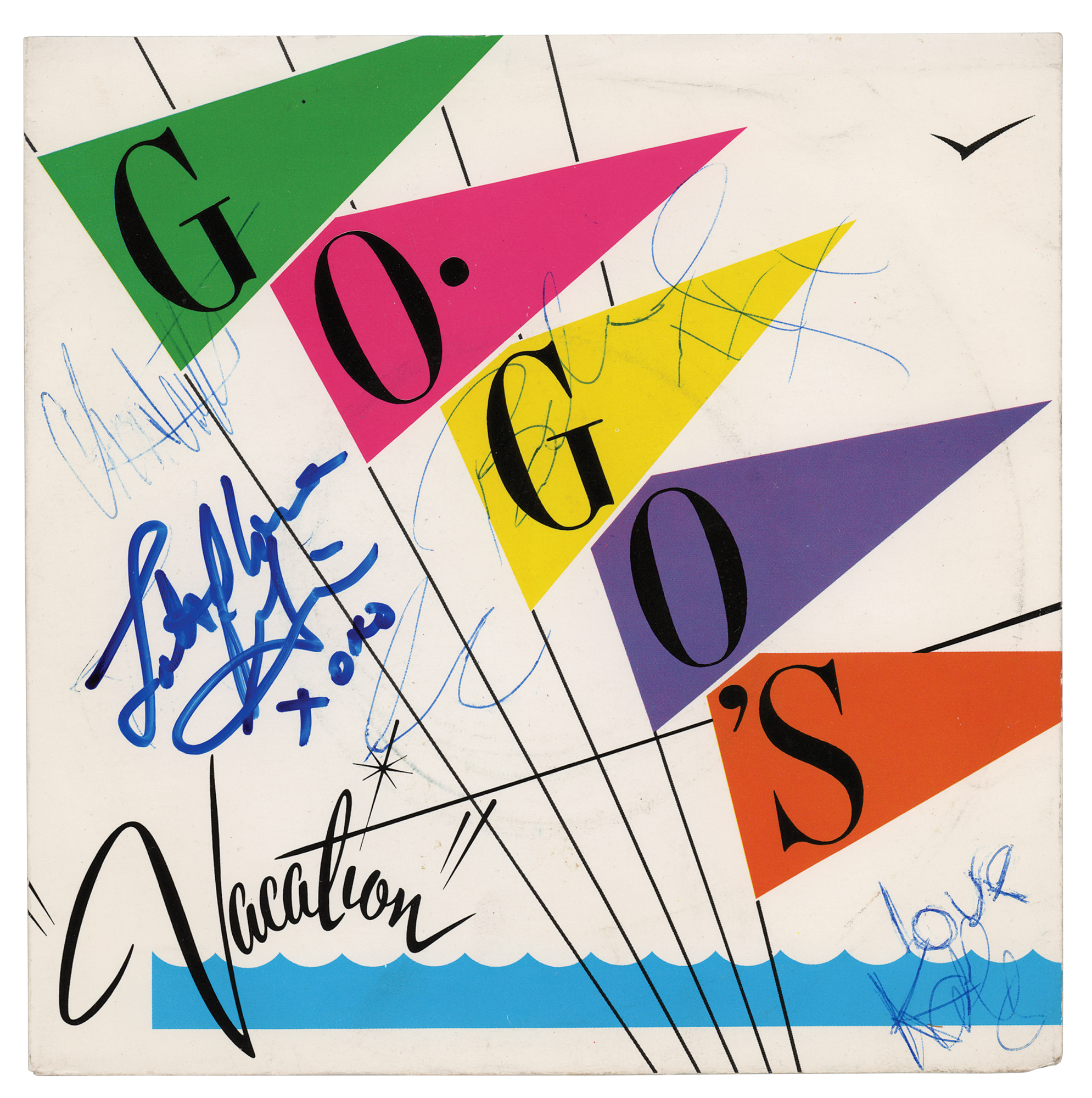 I.R.S. Records 45 RPM single for ‘Vacation / Beatnik Beach’ by the Go-Go’s, signed on the front cover in blue ballpoint, “Love, Kathy [Valentine]," "Charlotte [Caffey],” and “Belinda [Carlisle], xxx,” and in blue felt tip, “Lots of love, Gina [Schock], xoxo." In fine condition, with pen troubles forcing several to retrace their names. The record is included.