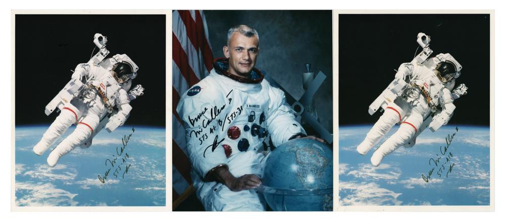 Three photos: two identical color 8 x 10 Lockheed Martin cardstock photos of McCandless's historic first untethered free flight, signed in black felt tip, "Bruce McCandless II, STS-41-B"; and a color glossy 8 x 10 photo of McCandless in his white space suit, signed in black felt tip, "Bruce McCandless II, STS41-b/STS-31." In overall very good to fine condition, with creasing to both cardstock photos, and a small corner tear to one of them.