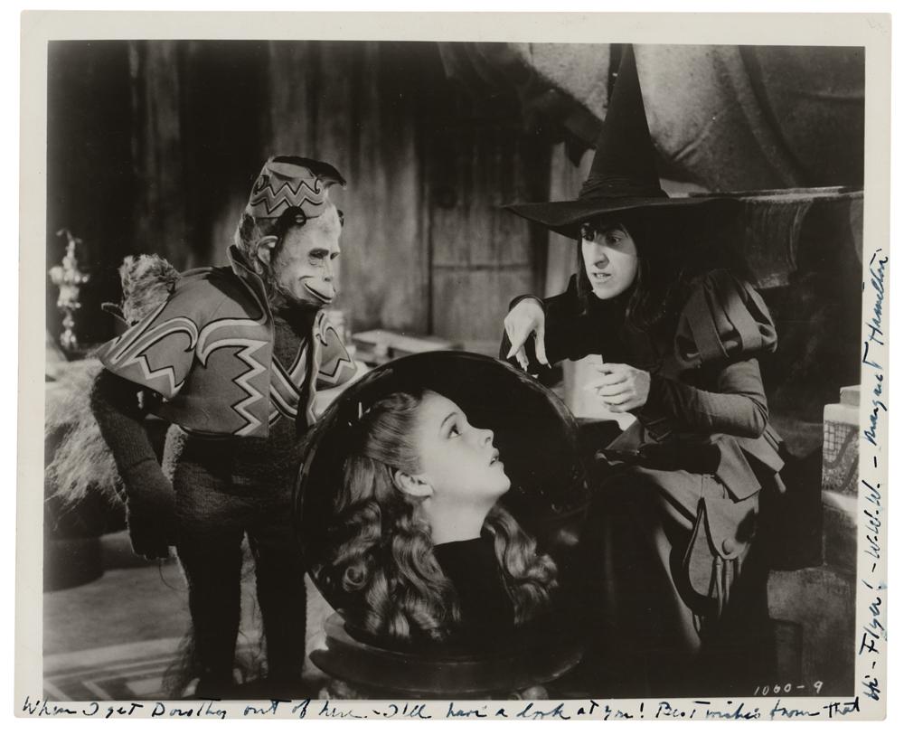 Glossy 10 x 8 photo of the Wicked Witch of the West and one of her flying monkeys staring into her crystal ball and finding Dorothy in a scene from The Wizard of Oz, signed in the margins in fountain pen, "When I get Dorothy out of here-I'll have a look at you! Best wishes from that Hi-Flyer!-W.W.W.-Margaret Hamilton." In very good to fine condition, with scattered creasing.
